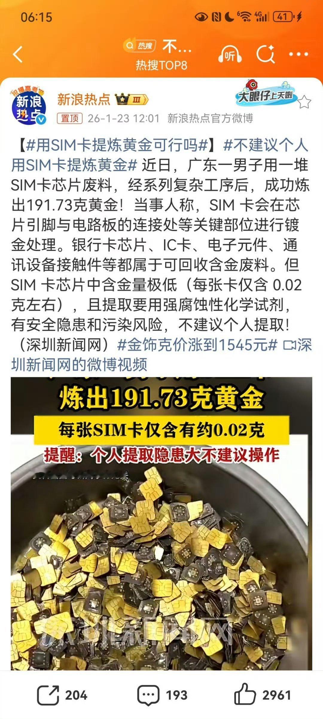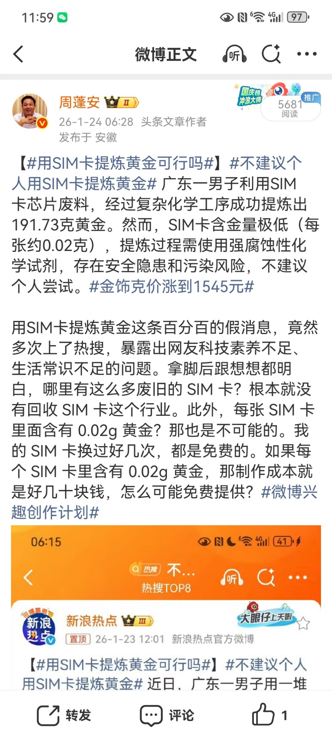 网传每张SIM卡含0.02克黄金系谣言【提炼2克黄金或需要超10万张芯片卡 】。1g黄金的区别有多大 这是正常人一眼就能看出的虚假消息,我在第一时间就就进行过分析(原文:网页链接),如今央视发文辟谣,当初发布这条“假消息”的正规媒体采编人员是否应该承担“造谣”的责任?