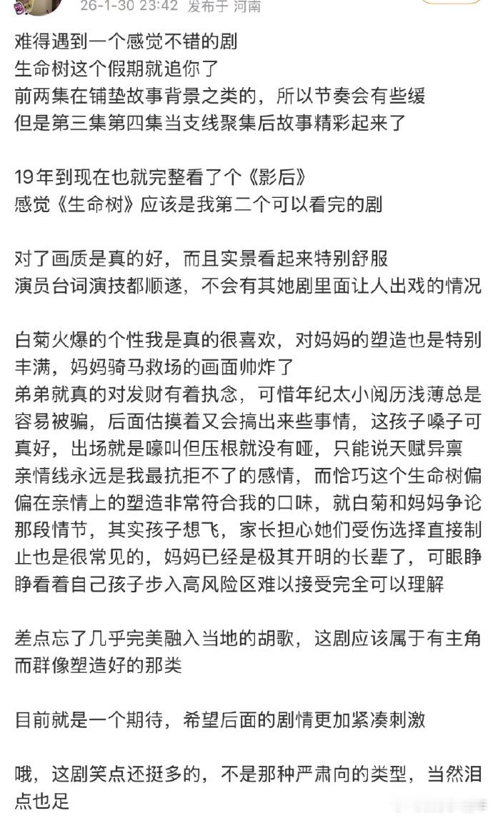 生命树真实评价纯路人被《生命树》狠狠圈粉!剧情不拖沓不注水,九十年代高原盗猎的故事讲得超落地,全员演技在线,原声台词代入感超强,刚播就爆口碑真的有原因!