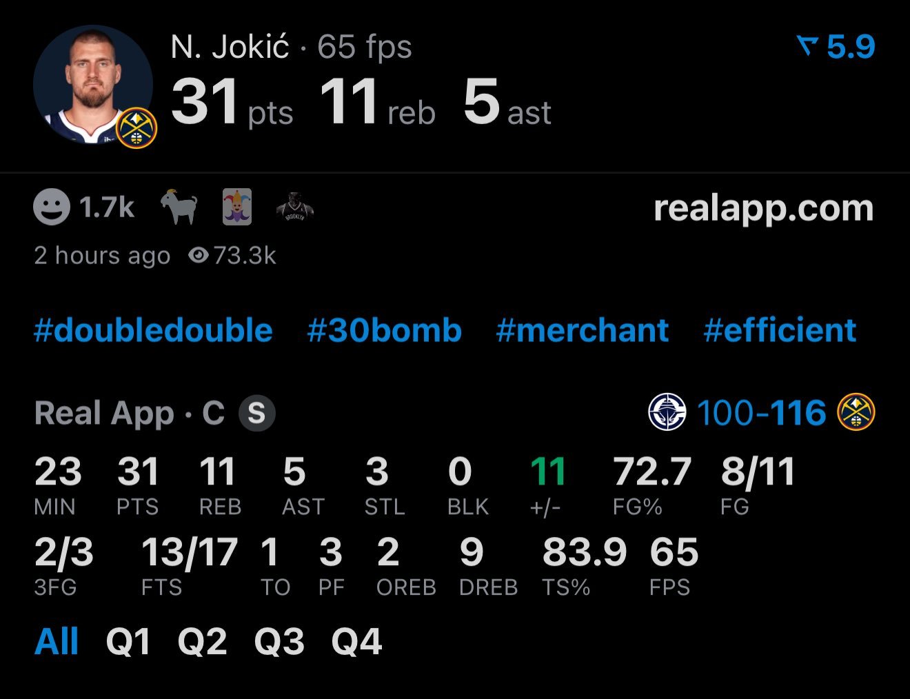 约基奇复出,24分32秒拿到31分12篮板5助攻,11中8。掘金全队投出的三分,击败过去19战16胜的快船。快船vs掘金NBA