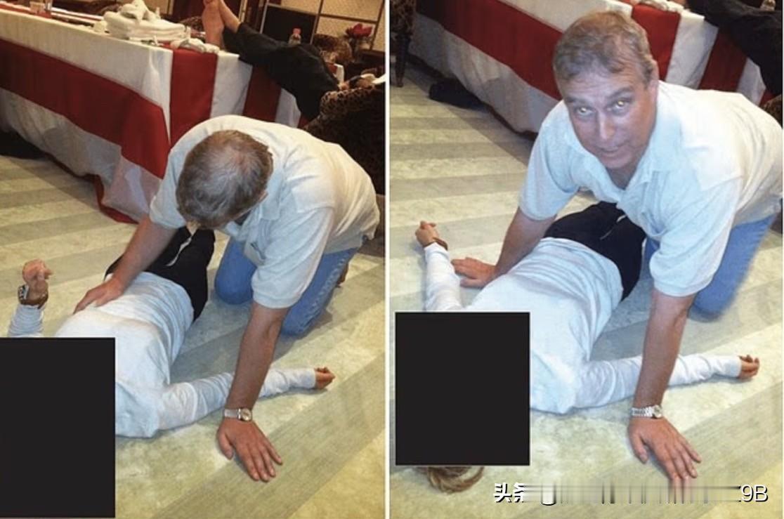 爱泼斯坦档案中的照片显示,安德鲁王子俯身靠近一名躺在地板上的女子。