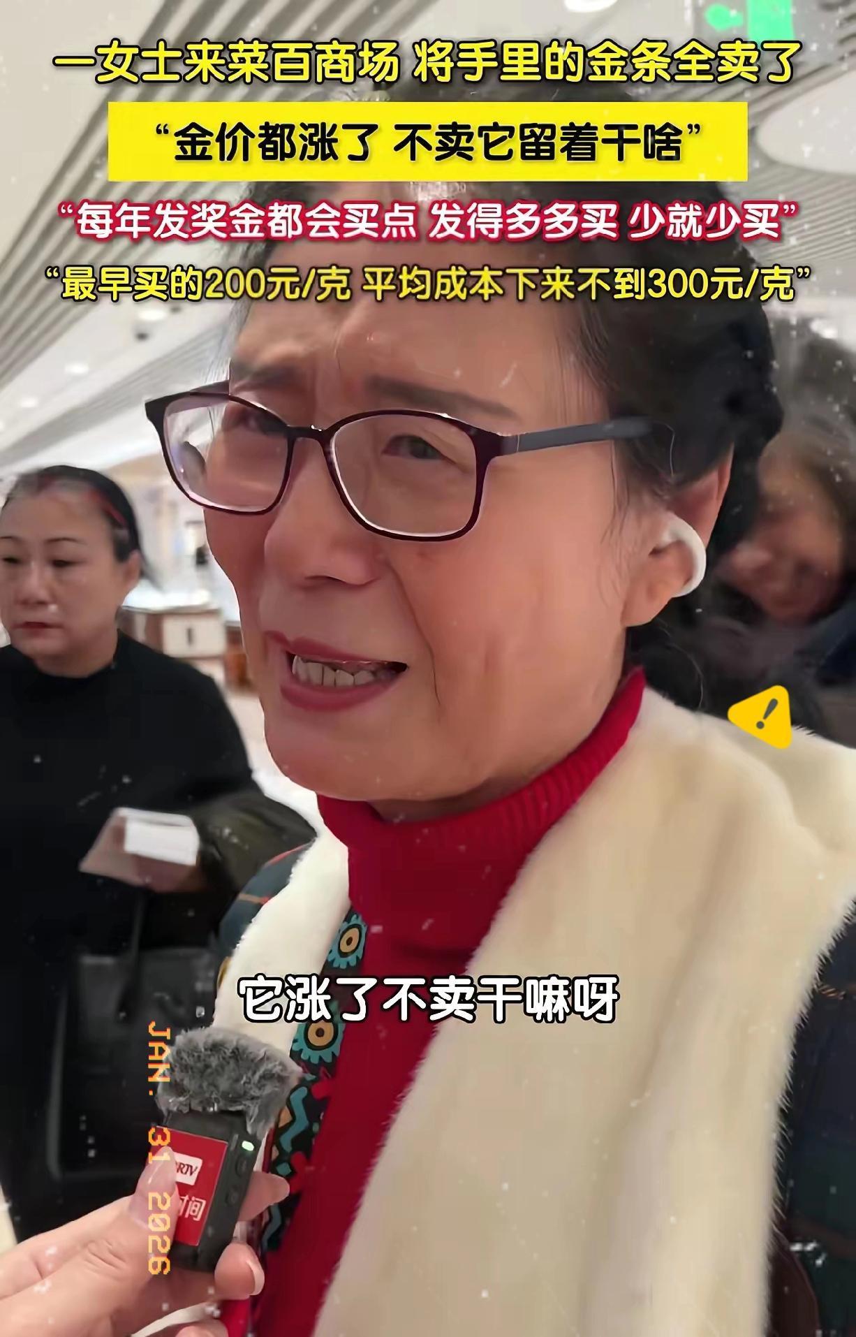 人间清醒!北京一阿姨看金价上涨,把十几年来买的金条全都卖了,有人问她怎么不留几根,阿姨直接回了一句:“它涨了不卖留着干啥?” 这阿姨是个脑子清醒的人,太清楚自己想要什么了。 阿姨说自己每年都能领到一笔年终奖,平时的工资足够她花了,所以这笔年终奖她就全拿来买金条。要是年终奖发的多,她就多买几根,发的少就少买几根,从来不会花额外的钱。 其实理财的最高境界,从来不是抱着资产等涨,而是懂的见好就收,阿姨把这个道理悟透了。用闲钱定投黄金十几年,不占用日常开支,不贪心追高,也不恋战持盈,高位果断清仓落袋为安,这比那些靠运气追涨的人高明太多。 当下金价大起大落,不少人看着涨势跟风入场,结果踩在高点被套牢,说到底还是缺了阿姨的这份理性和纪律。理财赚的从来不是运气的钱,而是认知和克制的钱,守住自己的投资边界,不贪不念,才是普通人最稳的赚钱路。 换做是你,在金价高点时能做到果断清仓,一根不留吗?