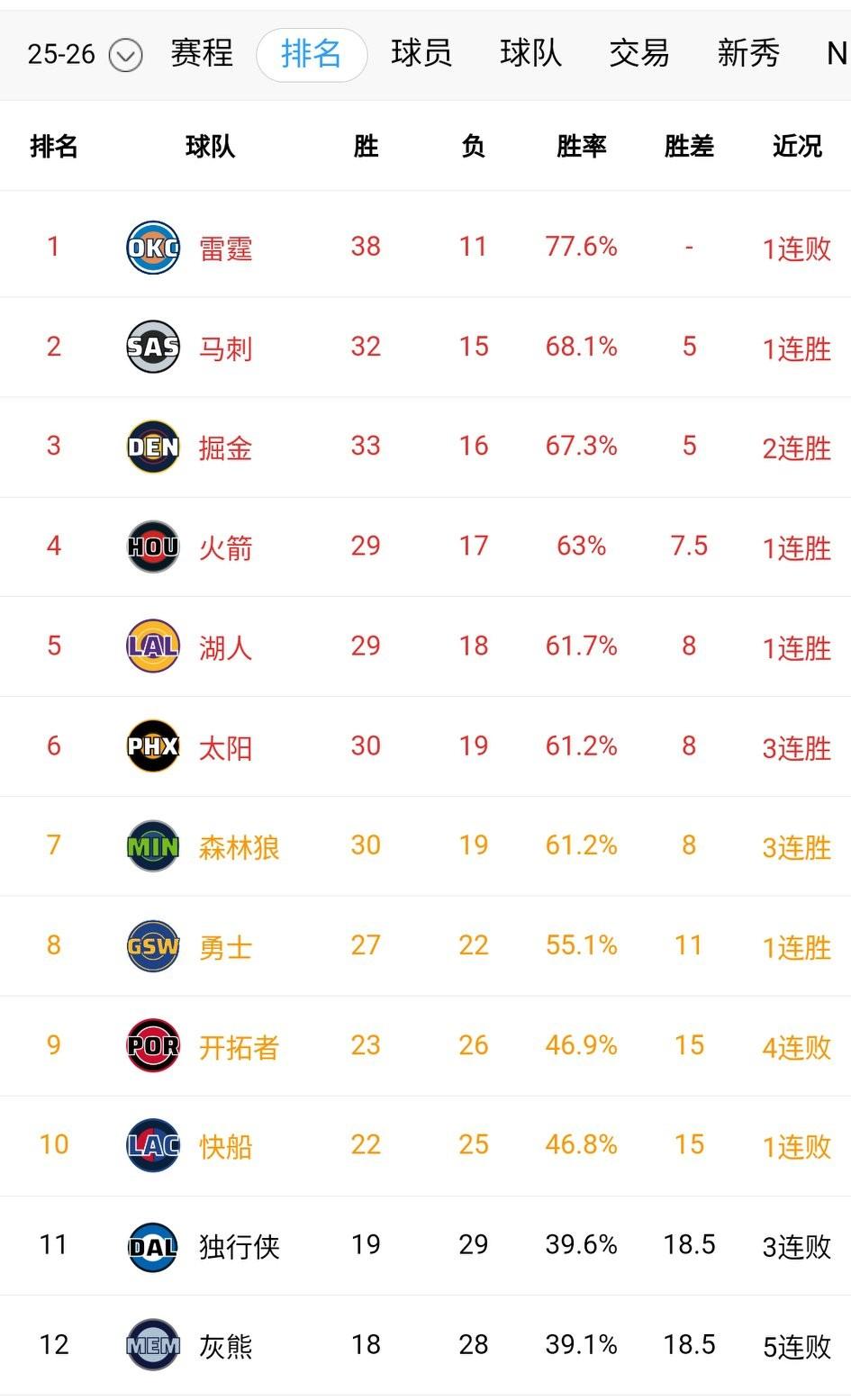 西部排名继续混乱,一场比赛改变几支球队排名…… 湖人太阳双双赢球,森林狼被挤到附加赛区了。 快船开拓者双双输球,不影响各自排名,依然稳居附加赛区。 勇士对于输赢没多大欲望,牢牢占据西部第八,上不能下不能。 掘金击败快船,胜场差追平马刺。