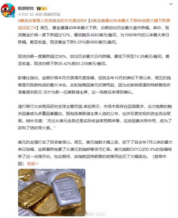 黄金遭遇40年来最大下跌现货黄金价格跳水超10%,白银一度暴跌近36%,你觉得后
