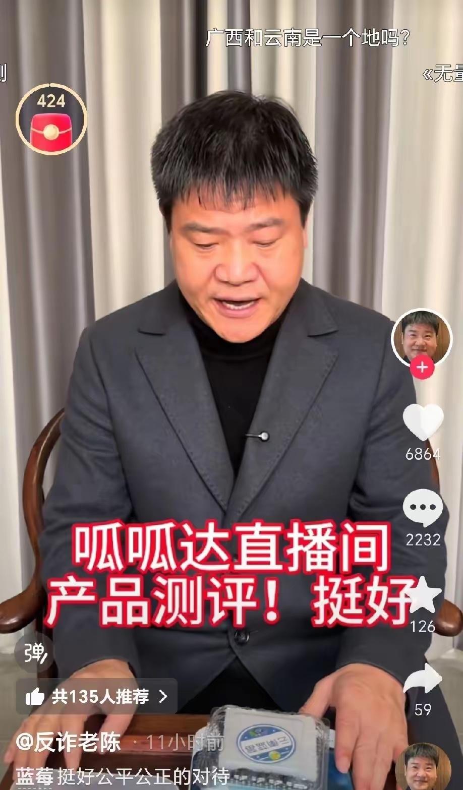老陈终于还是检测了宇辉家的产品: 一盒蓝莓用口检测的 检测完说了一句"挺好" 这是自己给自己找了个台阶下吗? 他不是要检测广西行所有产品吗? 只这一盒蓝莓说不过去吧? 网友估计也看出来了,还在评论区调侃:这检测标准够‘灵活’的啊,“蓝莓:我承受了不该承受的重量”。但不管怎么说,这事就算这么过去了,既没撕破脸,也没让之前的话落得太实,也算是种特别的处理方式吧。