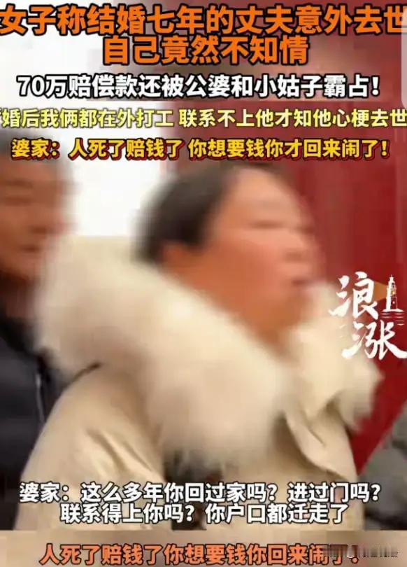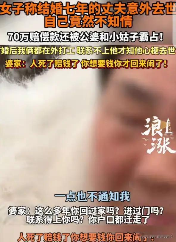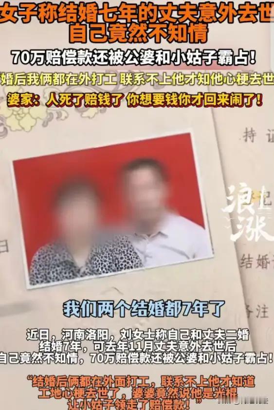 河南洛阳icon,刘女士和丈夫是二婚,婚后两人异地打工,靠电话信息联系,丈夫打工时心梗icon意外去世,单位赔了70万。刘女士联系不上丈夫,完全不知情,公婆却跟赔偿方说儿子是光棍汉,让小姑子领走赔偿款,一家三口把钱瓜分干净,刘女士得知后崩溃,她和丈夫感情深厚,却被瞒得连最后一面都没见上,公婆却指责她薄情寡义,多年不回家、联系不上,就是奔钱来的,刘女士认为自己虽和丈夫异地,但也是合法夫妻,小姑子凭什么冒领,公婆凭什么剥夺她继承权呢?河南婚姻悲剧 洛阳悲剧家庭