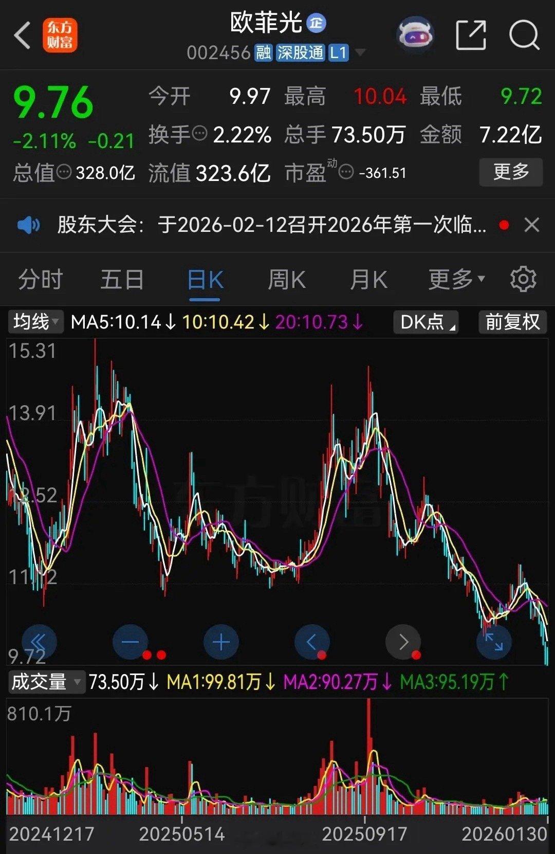 欧菲光,成为大白马股的时期,正是它成为苹果链供应商的时期。后来,苹果取消了它的供应商资格,它的股价就不行了。其后有一段时期,它又重新振作了起来,但2025年又重新出现了业绩下滑。按技术理论,公司股票在2026年的估值中轴,已经下移到8.30元附近,也就是说:本周五它的收盘价9.76元,仍未到达它的2026年合理估值中轴区。由此它的后市超卖区,理论上要到5.80元才行。中途的所有上升,都将成为反弹。光电概念的所有28只股票,我全都看了。其中2026年表现最好的将会是:莱宝高科 苏大维格 金龙机电 三安光电。注意,它们的启动时间,都是有些不同的。利亚德虽有多个基本面亮点,但它的中期股价表现,将只会一般。此外,与光电概念有些搭边的TCL科技,也会有较好的表现,不过要等到春节后。华映科技或许也有较好中期表现,但我必须提醒,它业绩非常差。如你们真要去参与,得心里有数。