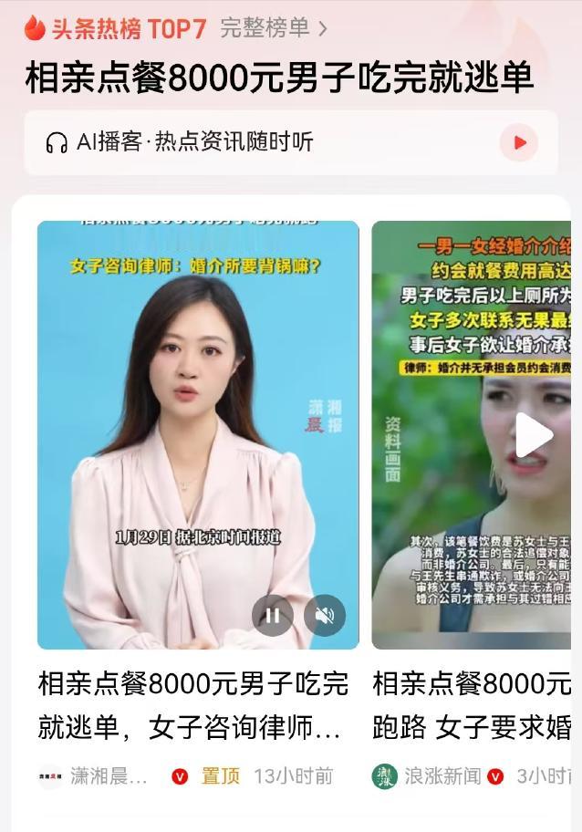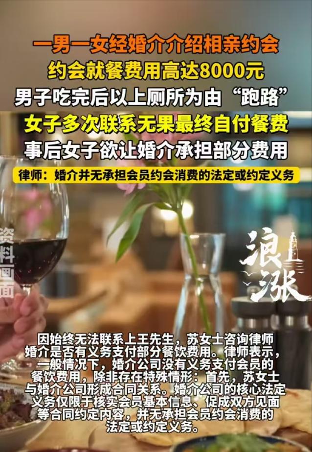 女子通过婚介和一男子约会,两人一顿饭就吃了8000元,饭后男子说他要上厕所,结果一去不复返,女子忍痛付了8000元,心里非常不服,竟然想让婚介分担一部分餐费! 苏女士年纪不算小了,也到了人生的另一道关口,想着找个条件合适的人过后半生就去了婚介所,交了会员费,填了信息。 婚介很快安排了第一次见面。对方姓王,条件写得都挺好,学历、职业、收入都在她心目中能打个高分,各方面一看就像个踏实人。 两人加了微信后没聊几句就约了吃饭,说是想见个面了解彼此。这听起来也合理,苏女士也觉得王先生挺主动,心里多少有些小期待。 见面的餐厅不是普通地方,是一家装修气派、气氛高级的地方,门头一看就知道不便宜。两人落座后,服务员训练有素,讲起话来都是带笑的,拿着菜单请他们点菜。 王先生并没有主动点菜,而是一副客气人的模样,让苏女士先来。苏女士看了下菜单,最便宜的菜都在三位数以上,不过这些菜看着都很精致,摆盘也高级,不是那种走量的快餐,很显然就是为了拍照发朋友圈的高端料理。 之前也没吃过这类餐厅,苏女士想着留个好印象,不想显得小气,就点了好几道招牌菜。王先生看她点了,也就顺着多点了几样。两个人一来一回,满满一桌子菜。 饭菜上来后两人倒也吃得有说有笑,聊了挺久,气氛很好,像是相识已久,也像是往下一步发展的节奏。苏女士看着王先生那温文儒雅的模样,不知道的还真以为撞见了缘分。 饭后王先生忽然站起来,说去趟洗手间,态度自然,还带着歉意。苏女士点了点头,继续坐等。时间过去了十分钟,又过去了二十分钟,服务员默默收拾着桌边的餐具,她越等越觉得不对劲,尝试打了王先生电话没有接,又发信息过去也没人看。 她叫来服务员让去卫生间看看,回来后说没人。人没了,联系不到,也没人买单,苏女士脸上的笑容一下子全僵住了。 她给王先生连发消息,后来连朋友圈都打不开,最后直接被拉黑。这一串流程下来让她头皮发麻,意识到自己被骗了,但此时满桌子的菜还在桌上,不买单根本走不了人。 服务员还是客气的,但句句话都在提醒她得付钱,周围还有人看着她。最终她只能硬着头皮刷卡交了8000块钱,出了餐厅整个人几乎虚脱。 事后她找到婚介理论,说她是听信婚介推荐才选择的这位男士,如今被骗餐费,婚介有没有责任至少帮她分担一半。这件事没个着落,她跑去咨询律师。 律师的回答让她心凉了半截。婚介和她签的合同里写得清清楚楚,他们的职责是介绍相亲对象,保证对方身份真实,至于见面后去哪吃饭,点什么餐,都属于个人选择,婚介没有义务为此埋单。 除非苏女士能拿出确凿证据证明婚介和王先生是一伙的,骗她钱,他们之间就没有连带责任。更别说合同里也没写婚介得为会员的用餐负责。 有人猜测,王先生有可能是饭托,专门找人出去吃顿大的就跑,还有人怀疑苏女士其实是想坑男方,可见面后男方察觉异常才反其道而行。 也有人说,管他谁是骗子,这俩人都不正常,一顿饭吃8000,明明才第一次见面,就这么点菜也不心虚,咋就不多留个心眼? 虽然看似只是普通的相亲事故,但从头到尾却暴露了很多问题。婚恋平台名义上是帮人牵线搭桥,可一旦出了矛盾,真有几家会为会员兜底?经济条件好的男子是真的存在没错,但那样的人真会在第一次见面就花这么大手笔请吃饭?相亲过程风险其实很多,谁也不能保证对方就一定靠谱,更不能把命运全交给那几页资料和中介的一张嘴。 苏女士这次损失的不只是8000块,更是她对人的信任。她以为找到的是有缘人,却没想到进了套。这个事情闹得沸沸扬扬,但大多数人也只是围观热闹,至于损失怎么挽回、责任该怎么追究,其实没有几个答案。 事情发生了就得接受,但接受不代表要吞下苦果不吭声。苏女士的问题,核心仍然在于那位失联的王先生。目前最现实的办法还是报警立案,追查王先生的真实身份。如果能查出他确实存在诈骗意图,那么后续的民事索赔和刑事责任就另当别论。 也提醒所有还在奔波相亲的单身人士,别被资料迷了眼、别被浪漫冲昏头。吃饭不是关键,合不合适才要紧。点菜的时候多留个心眼,说不定能避免吃上哑巴亏。 信息来源:浪涨新闻 相亲点餐8000元男子吃完就逃单
