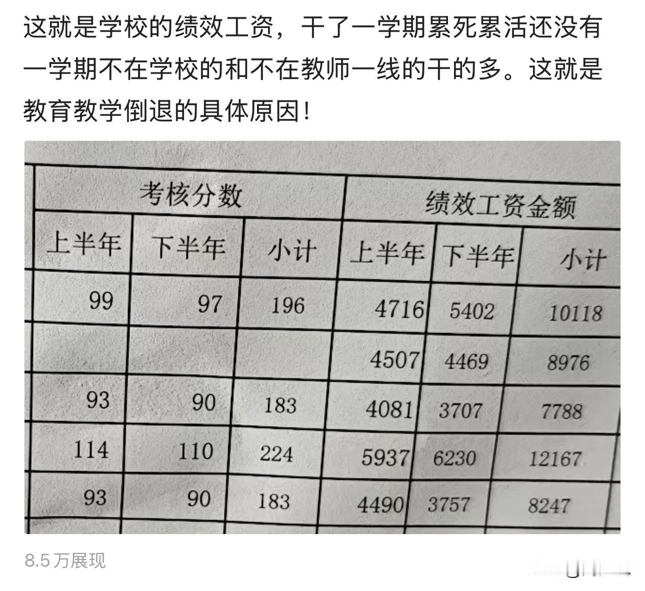 “太戳心了!”安徽一位教师晒出学校的绩效工资,一句话引发热议:“累死累活干满一学期,到手绩效工资,居然比不上那些一学期没在校、甚至不在教学一线的人,这就是教育教学倒退的原因。” 这事在网上传开后,不少网友看了也跟着感慨:“真是寒了一线老师的心啊,这样的分配方式,谁还愿意好好教书”。 客观的说,周少特别理解这位教师的心情。绩效工资的初衷,本是激励大家好好干。可是一旦分配背离了“多劳多得、优绩优酬”的原则,就容易打击一线教师的积极性。 当然,不是所有学校都存在这样的问题,但这种不合理的现象,确实会慢慢消磨老师们的热情。希望该校重视一下,别寒了在一线工作教师的心。 不过,这位教师也不必心寒,看了一下绩效差,最高和最低也不过是三四千的区别。按照企业来说,作为公司领导,绩效高一点,也是合理的范围。#寻美三湘# #长沙新朋友#