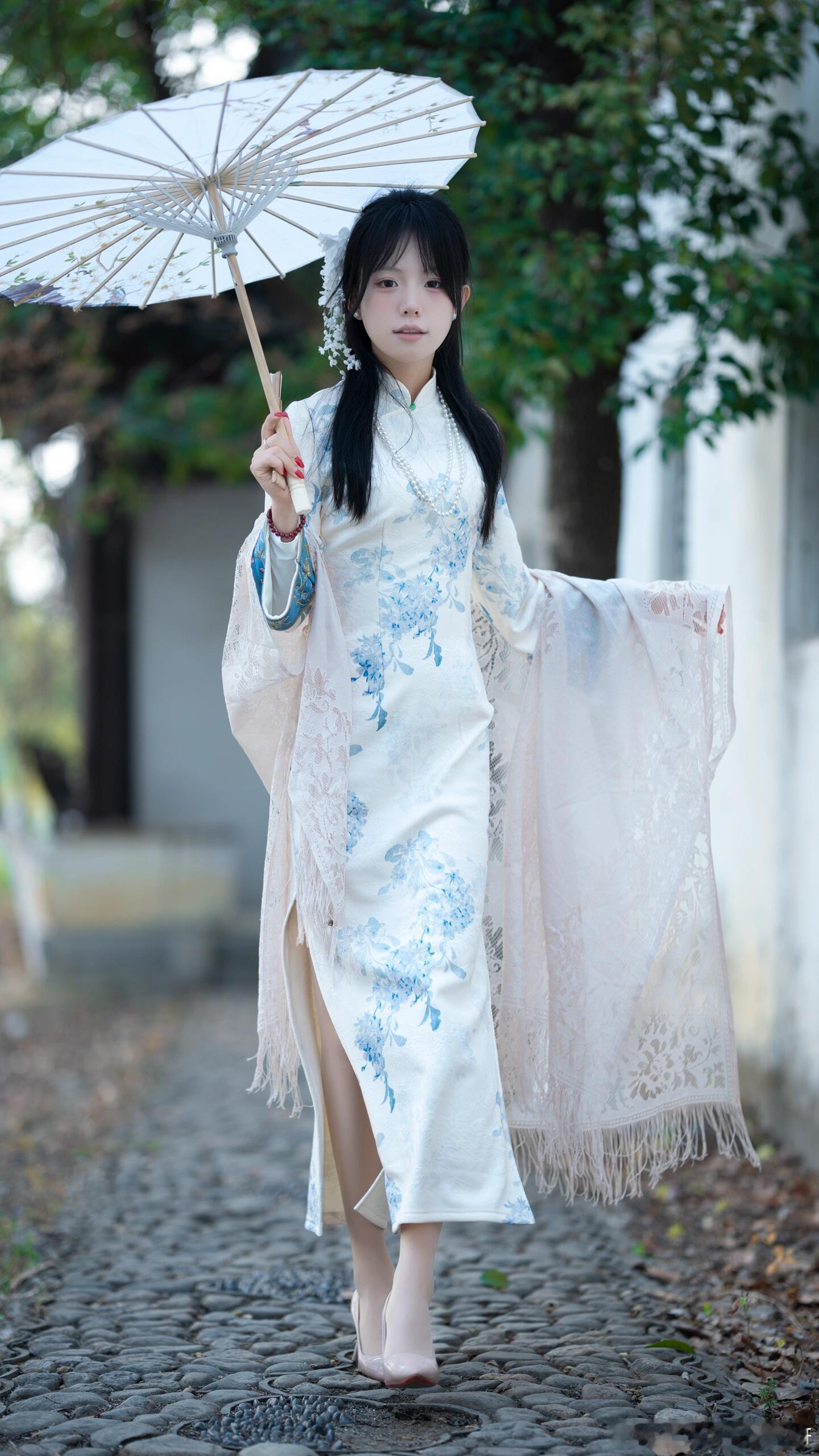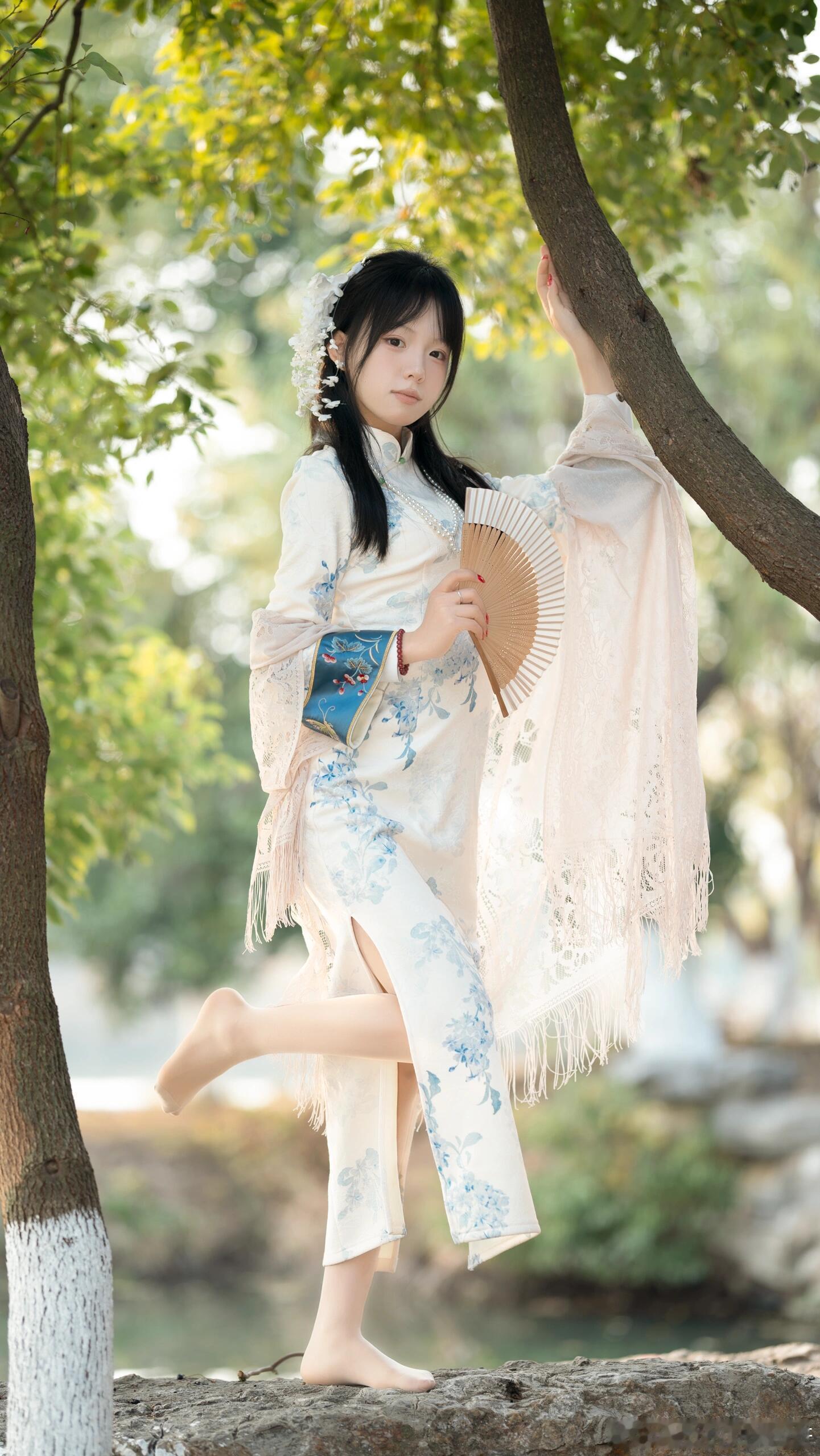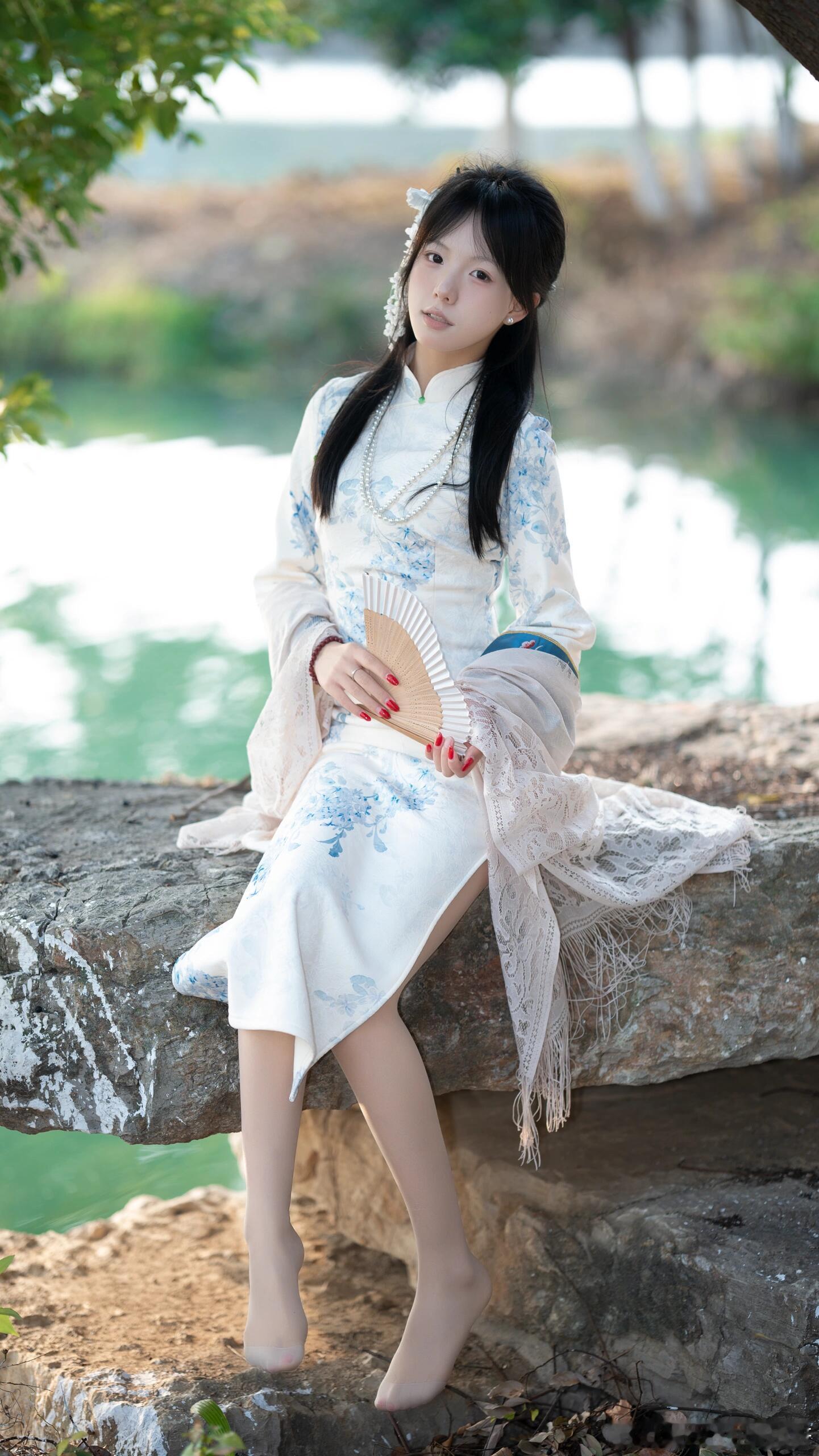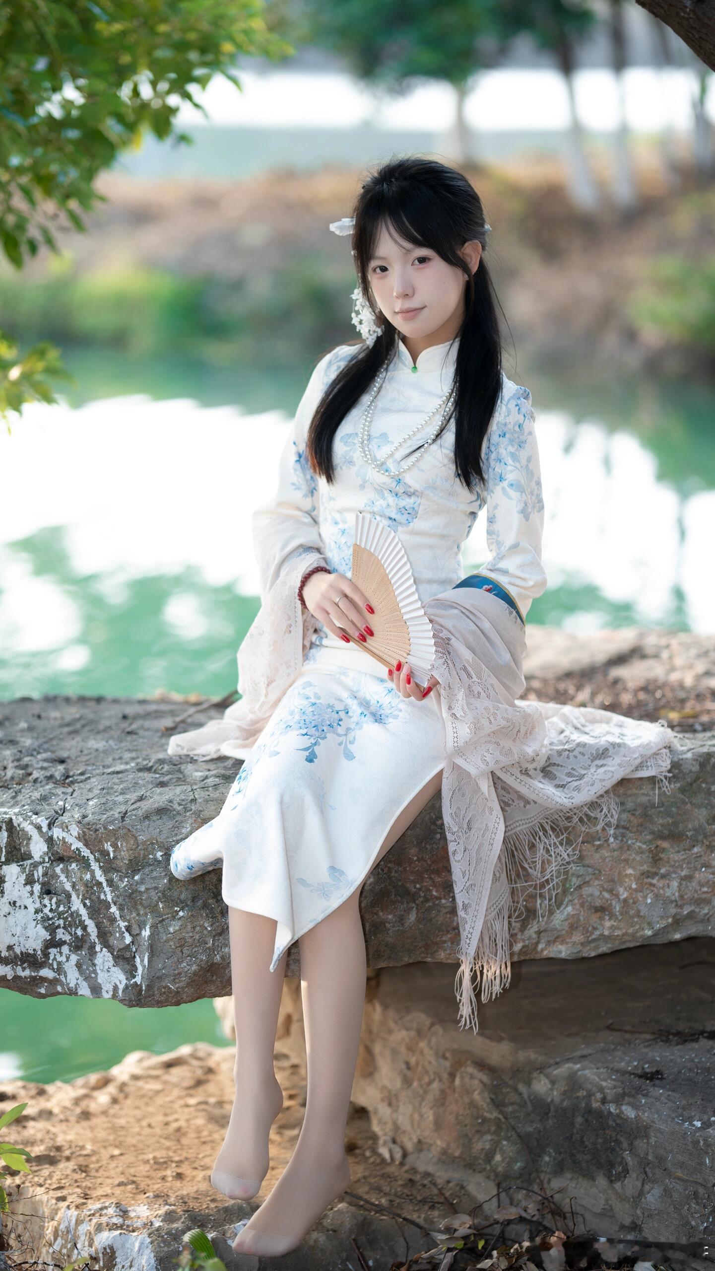 白色旗袍雅韵生,恰如写意山水中。贴身裁剪显性感,宛若清水出芙蓉。