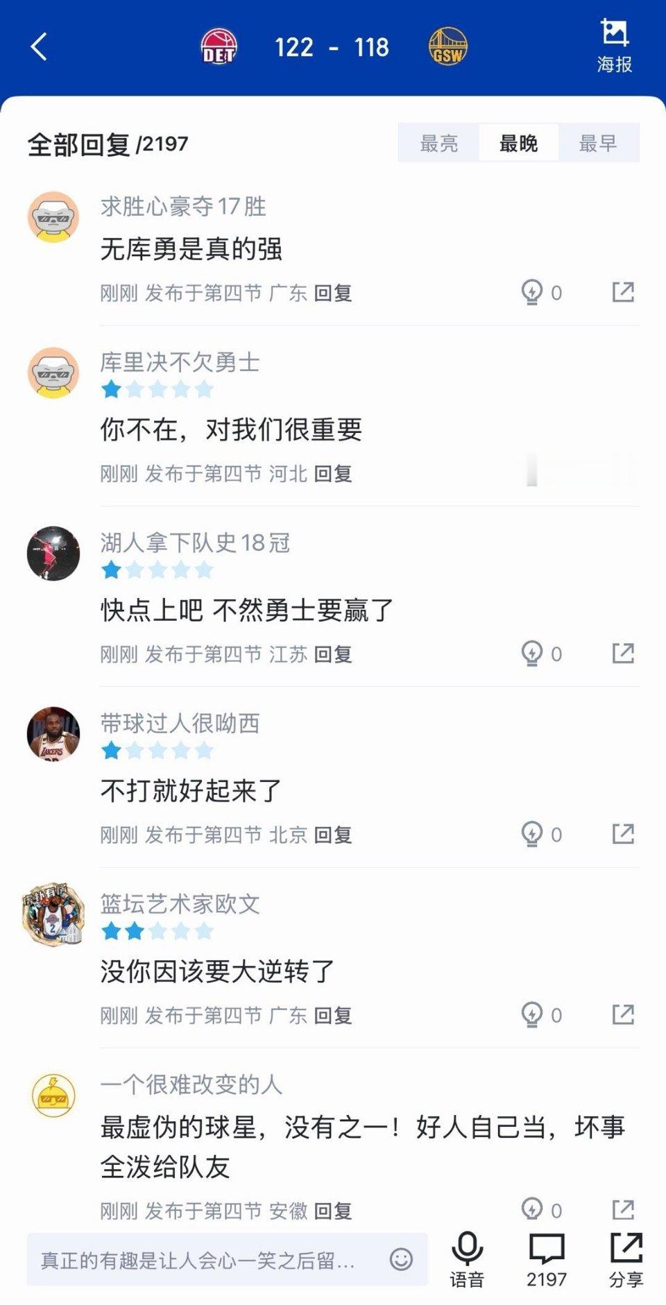 “最虚伪的球星,没有之一”“一看打不过,智能伤病”分差13后。眼瞅着死活追不上,库里马上启动伤病管理!没想到全体勇士球员真不惯着库里,库里一下去,勇士疯狂追分,最少追到只差4分。差点赢了!如果库里今天不打,勇士稳赢!