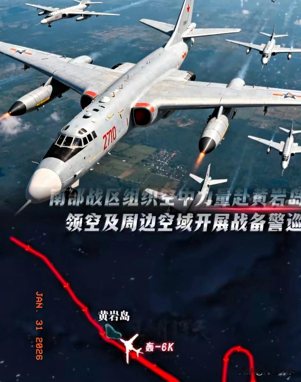 敢画下禁飞区,画下禁飞区,门都没有 1月31日,在黄岩岛上空,中国人民解放军南部战区轰-6K轰炸机与歼击机编队呼啸破云,直插黄岩岛空域沿东南方向直飞巡航,当着菲律宾的面切入其非法划设的所谓演习禁飞区域。 我翻了国防部通报才清楚,菲律宾这是明目张胆侵权。1月21日就划了10万平方公里演习区,把黄岩岛整个裹进去,还想禁飞两个多月,纯属痴心妄想。 黄岩岛是中国固有领土,早就划定领海基线。菲律宾没经任何批准,就敢把中国领空当演习场,这已经不是试探,是赤裸裸的挑衅。 轰-6K可不是吃素的,能挂载反舰导弹远程打击,歼击机护航形成攻防体系,编队巡航就是亮肌肉,告诉对方别瞎折腾。 菲律宾刚拿到韩国交付的“苏莱曼”级巡逻舰,就飘得没边了。2400吨的船在南海根本不够看,真硬碰硬纯属自讨苦吃。 南部战区从1月初就没停过巡逻,海空力量24小时监控。菲律宾的一举一动都在掌控中,想搞小动作门都没有。 那些被菲律宾拉来的“盟友”也没敢真动手。2025年美日法联合演习,结果全程被解放军跟踪,连浪花都没溅起来。 10万平方公里演习区看着唬人,相当于三个海南岛大。可菲律宾海军实力撑不起,说白了就是政治作秀,想转移国内矛盾。 国际法早有定论,未经主权国同意划设演习区非法无效。菲律宾这波操作,连不少东盟国家都看不下去,没一个出来站队。 解放军这次巡航是依法维权,不是挑事。你敢划禁区,我就敢穿过去,主权问题上没有商量余地,半步不让。 我特意查了菲律宾的演习备案,连基本的国际通报流程都没走。这种单边挑衅行为,在国际上根本站不住脚。 菲律宾马科斯政府心里打小算盘,想靠对华强硬稳住支持率。可南海问题上搞投机,最后只会搬起石头砸自己的脚。 话说回来,我真觉得这波亮剑太提气了。对付霸权挑衅,就得用实力说话,解放军的巡航就是最硬的回应。 和平不是靠妥协换的,是靠实力守的。黄岩岛的每一寸领空领海,都有解放军守护,谁也别想觊觎。 域外势力想借菲律宾搅乱南海,可解放军的常态化巡航已经织密防护网,任何挑衅都只会自取其辱。 各位读者你们怎么看?欢迎在评论区讨论。