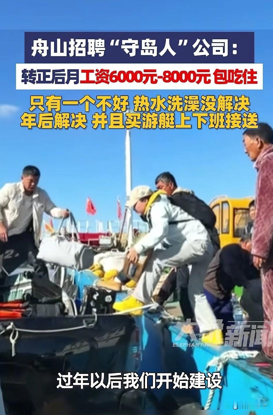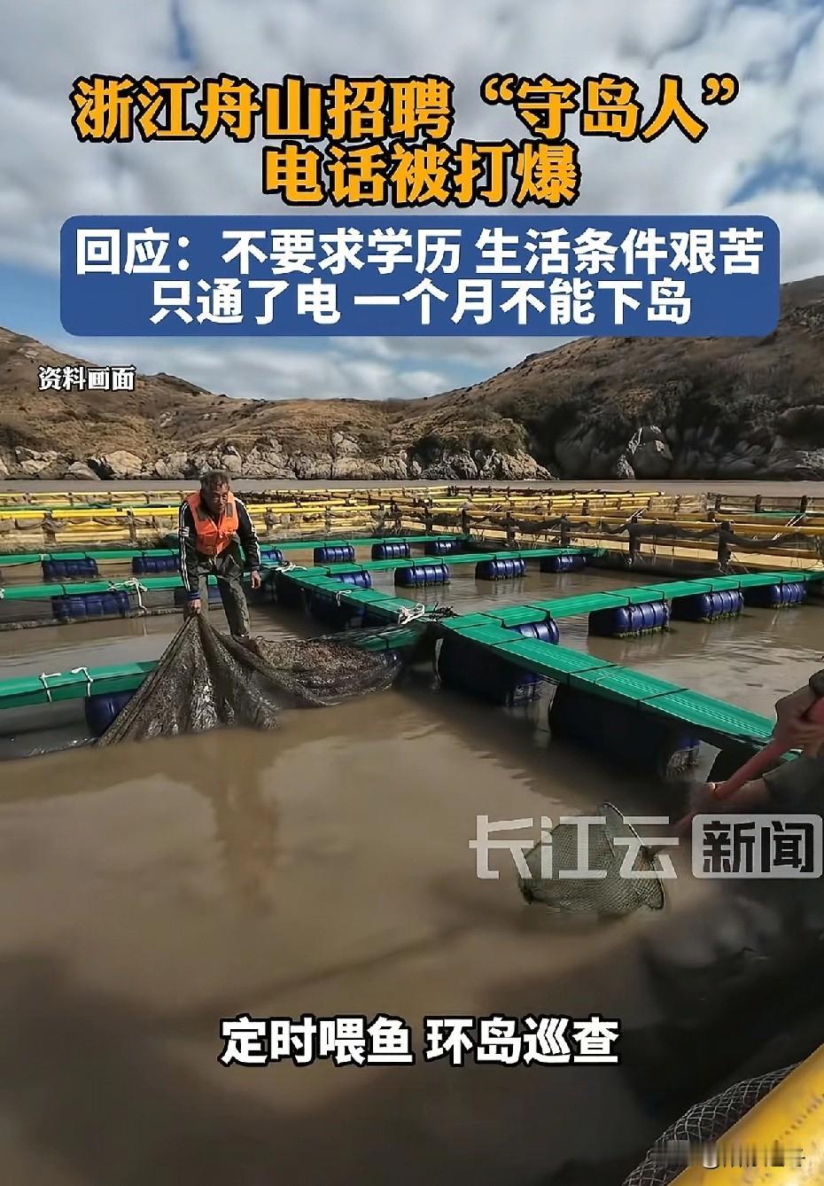 招聘2名守岛人,不能1男1女![大金牙] 无学历要求,工作简单轻松,四险一金,转正工资更高,“摸鱼时间较多”,剩余时间打打游戏,不喜欢社交的,能耐的住寂寞的,喜欢吃海鲜的都可以报名,但是必须要在岛上呆满一个月! 1月31日,浙江舟山一家公司招聘“守岛人”登上热搜,此次共招4人,要求很简单,无学历要求,男女不限,但是不能一男一女,这个要求还是蛮低的,大部分人都能接受。 另外,每天干的活也很简单,就是负责给养殖场每天定时喂料,每天巡检几次,简单的设备维护保养,工作简单,容易上手。 至于待遇也还不错,第一个月3000元,第二个月转正6000元到8000元不等,还交四险一金,包吃包住,海鲜自由!其实待遇不是特别好,关键就是自由、轻松,主打一个不用“内卷”! 岛上生活条件目前还不是很完善,有电、有Wi-Fi、没有空调,一周配送一次生活物资,其实这些都能接受,有无线网就可以接受了![呲牙] 目前,据这家公司称已经收到了上千份简历,公司电话已经被打爆了,报名的人基本上都是年轻人,看来大家都钟爱这种比较自由的职业吧!舟山守岛人 浙江守岛人 舟山选拔