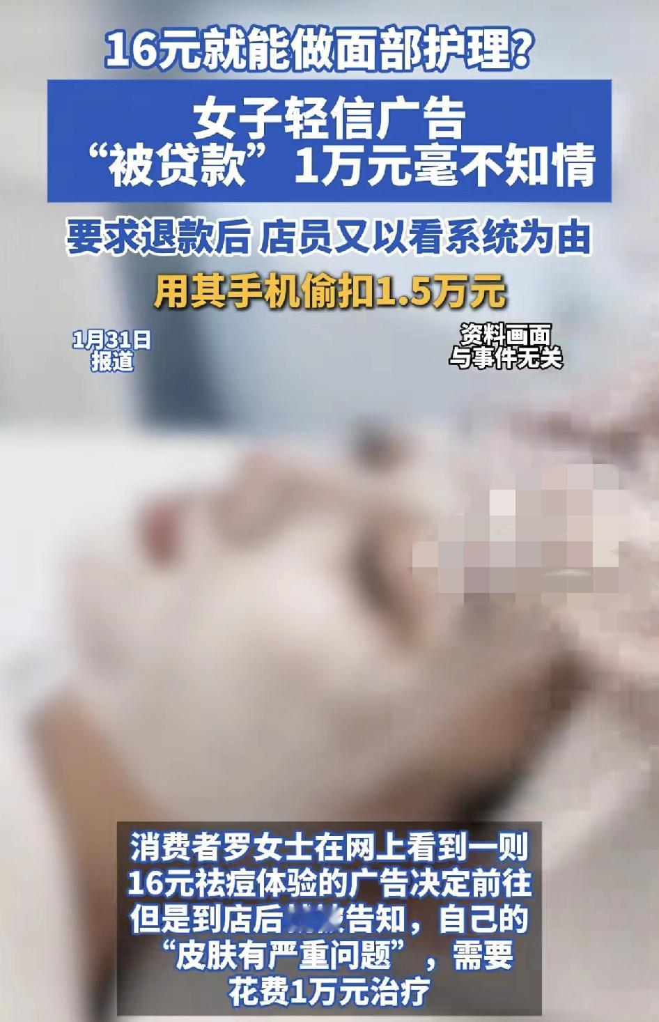 女子看到网上有16元可以做面部祛痘的护理,于是决定到前往店里尝试一下,到店之后,被店员告知自己的皮肤有严重的皮肤问题,需要1万元的治疗,当时女子明确拒绝了,因为自己身上没有钱。但是店员在女子不知情的情况下,偷偷的拿着手机贷款了1万元。几天之后,女子要求退款,店员又以查看手机系统为由,再次在手机上划走1.5万元。这种明目张胆的拿着自己的手机去贷款的行为,实在是太可怕了,所以千万不要现在的低价美容护肤广告所欺骗。