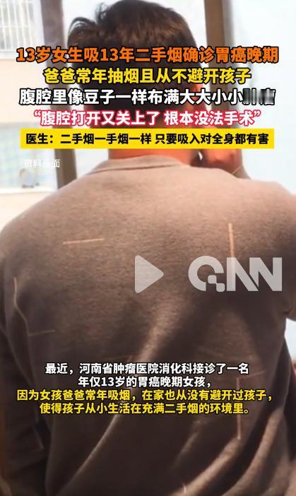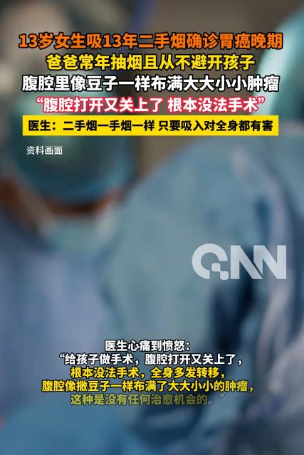 破防!河南一13岁女生吸13年二手烟,确诊胃癌晚期,爸爸常年抽烟且从不避开孩子。腹腔里像豆子一样布满大大小小肿瘤,医生直言“腹腔打开又关上了根本没法手术"。医生:二手烟一手烟一样只要吸入对全身都有害! 河南一名13岁女生被确诊为胃癌晚期,腹腔打开又无奈关上,根本无法手术——里面像撒豆子一样,布满了大大小小的肿瘤, 而这一切的元凶,竟是爸爸常年抽烟从未避开她,让她被动吸了13年二手烟,医生直言,二手烟和一手烟危害相当,只要吸入就会伤害全身。 这名13岁女生从小生活在烟雾缭绕的家庭里,爸爸有着多年的吸烟习惯,不管是在家中客厅、卧室,还是吃饭时,都毫无顾忌地抽烟, 从未刻意避开孩子,也从未意识到二手烟会对女儿的身体造成致命伤害。女生从出生起,就被动吸入二手烟,这一吸,就是整整13年。 起初,女生只是偶尔出现腹胀、食欲不振的情况,吃饭时总觉得恶心,甚至偶尔会胃痛,家人误以为是孩子挑食、肠胃不好,没放在心上, 只是简单给她吃了点调理肠胃的药,从未想过要带她去医院做全面检查,就这样错过了最佳的排查和干预时机。 随着时间推移,女生的症状越来越严重,胃痛变得频繁且剧烈,吃不下饭、睡不着觉,体重也快速下降,整个人日渐消瘦,脸色苍白得吓人,连走路都没力气。 直到女生一次突发剧烈腹痛,疼得浑身蜷缩、冷汗直流,家人才终于慌了神,赶紧驱车将她送往河南省肿瘤医院就诊。 抵达医院后,医生快速为女生开展胃镜、腹部CT等一系列检查,全面排查身体状况,检查结果出来后,所有人都陷入了绝望——女生被确诊为胃癌晚期,肿瘤已经全身多发转移,情况远比预想中更糟糕,医生直言,治愈的希望十分渺茫。 为了尽力挽救女生的生命,医生决定尽快为她安排手术,可当腹腔被打开的瞬间,连经验丰富的医生都倍感揪心。 腹腔里布满了大大小小的肿瘤,密密麻麻像撒了一把豆子,肿瘤已经广泛转移,根本无法彻底切除,无奈之下,医生只能将腹腔重新关上,宣告手术无法进行。 医生结合女生的年龄和病情分析,她患上胃癌的核心原因,就是长期吸入二手烟。二手烟中含有至少69种致癌物,长期暴露会诱发胃癌、肺癌等多种疾病, 对呼吸系统和消化系统尚未发育完全的青少年,危害更是加倍,而女生整整13年的被动吸入,让身体长期遭受致癌物侵蚀,最终酿成悲剧。 医生特意强调,二手烟和一手烟的危害没有区别,只要吸入,烟草烟雾中的致癌物就会扩散到全身,损伤各个器官,且二手烟没有安全剂量,任何程度的暴露都可能带来健康风险。 这起悲剧也并非个例,近期多地医院接诊的青少年呼吸道、消化道疾病患者中,不乏长期暴露在二手烟环境中的案例。 此事被报道后,全网陷入热议,网友们满心心疼的同时,也纷纷感慨二手烟的可怕。有人留言“爸爸的无知,毁了孩子的一生”,也有人提醒“烟民在家抽烟一定要避开家人,尤其是孩子”。 一场长达13年的被动吸二手烟,毁掉了一个花季少女的未来,也给所有烟民敲响了警钟。对此,你们有什么看法,欢迎评论留言~