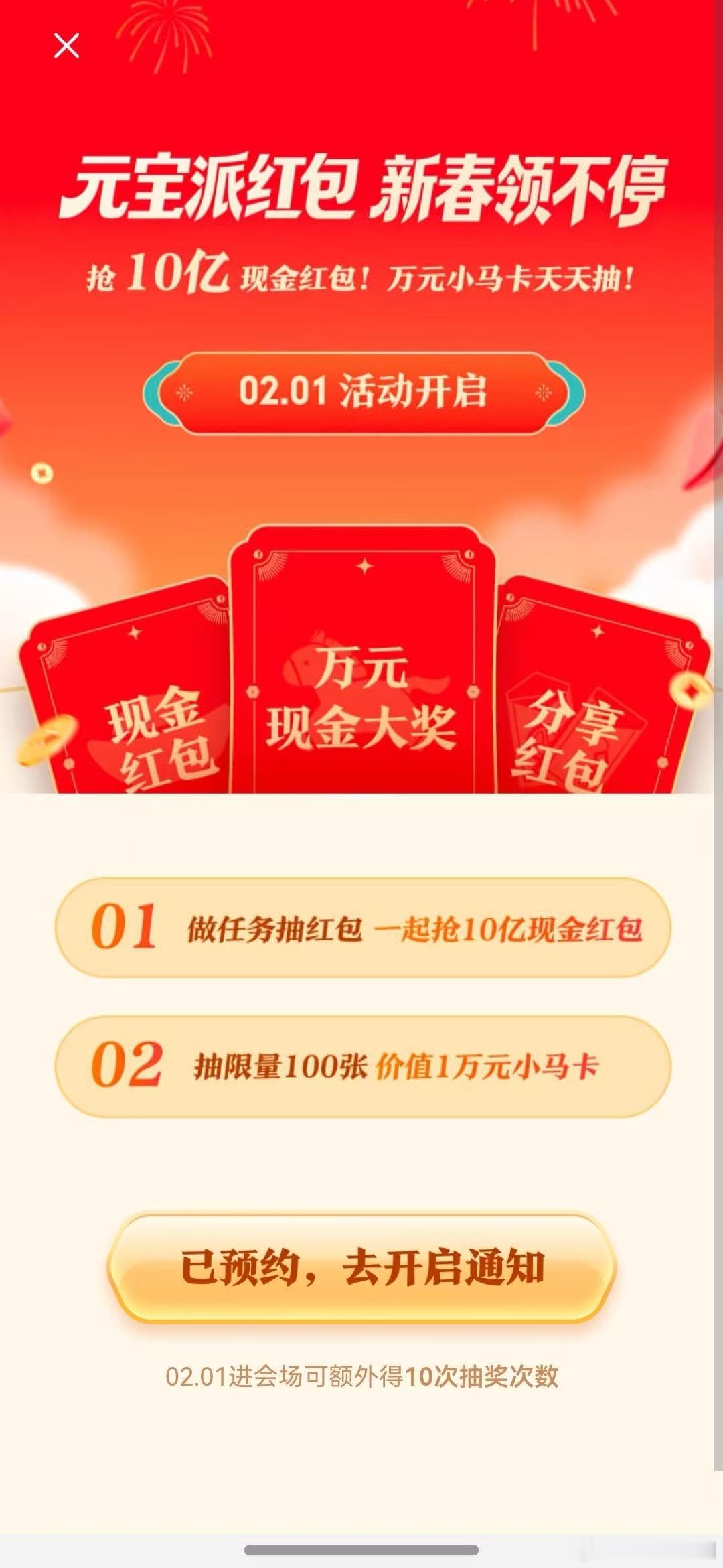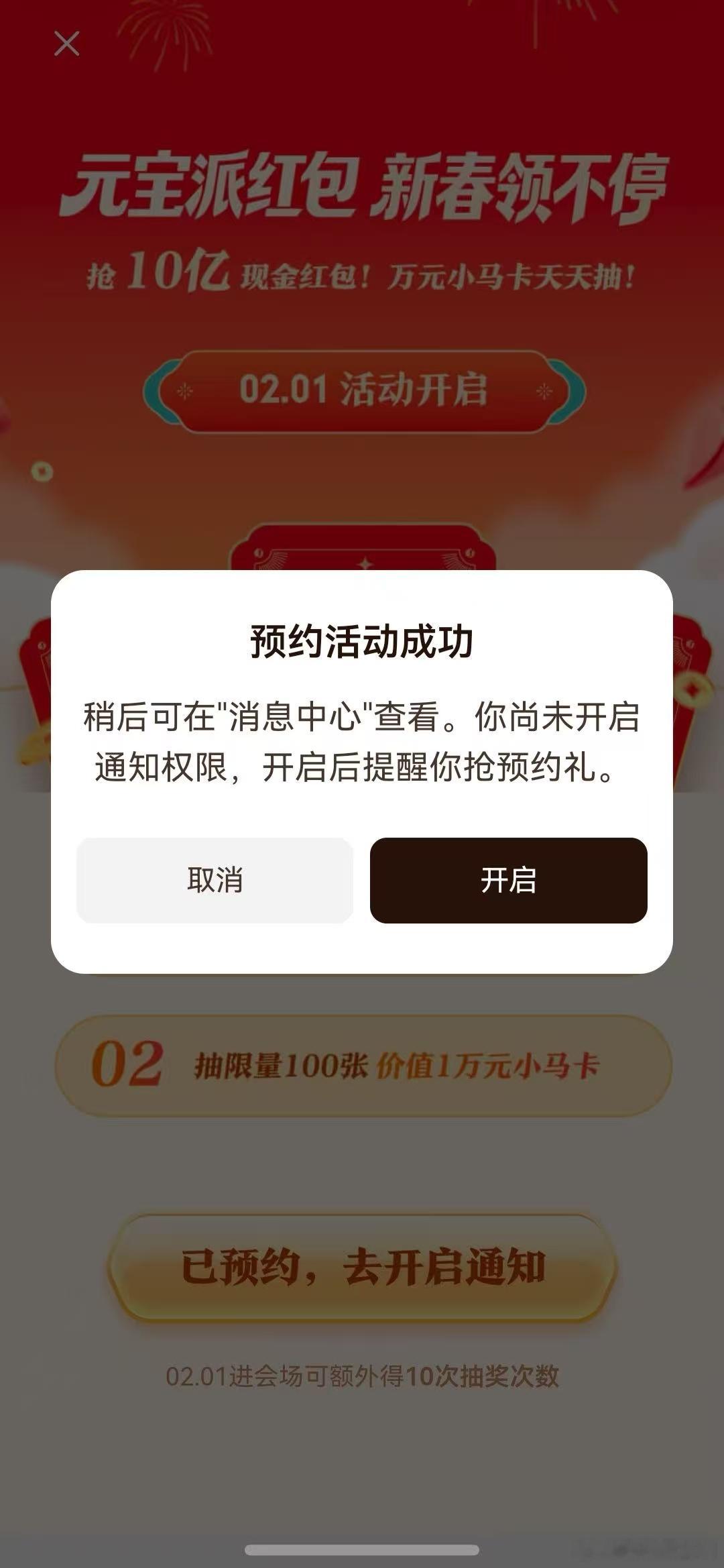 3️⃣ 预约:首页就能看到活动弹窗,点预约!一定要提前约!可以多10次抽奖机会,之后可以从消息中心进入,记得开通知,2月1日准时开抢!