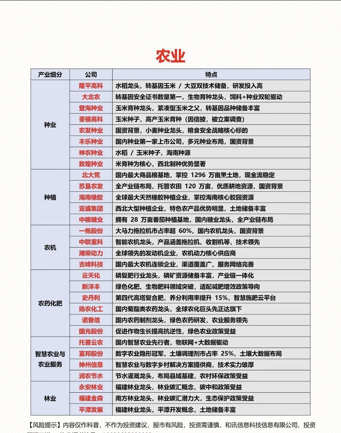 农业龙头盘点:隆平高科领跑种业,大北农深耕生物育种,北大荒稳握黑土地,中联重科智造农机,扬农化工绿色农药护航,智慧农业赋能乡村振兴。
