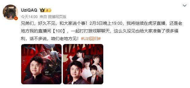 爷青回!Uzi正式官宣复播,这次回归也顺手拉来了呼吸、小天、兮夜和小明组成全新车