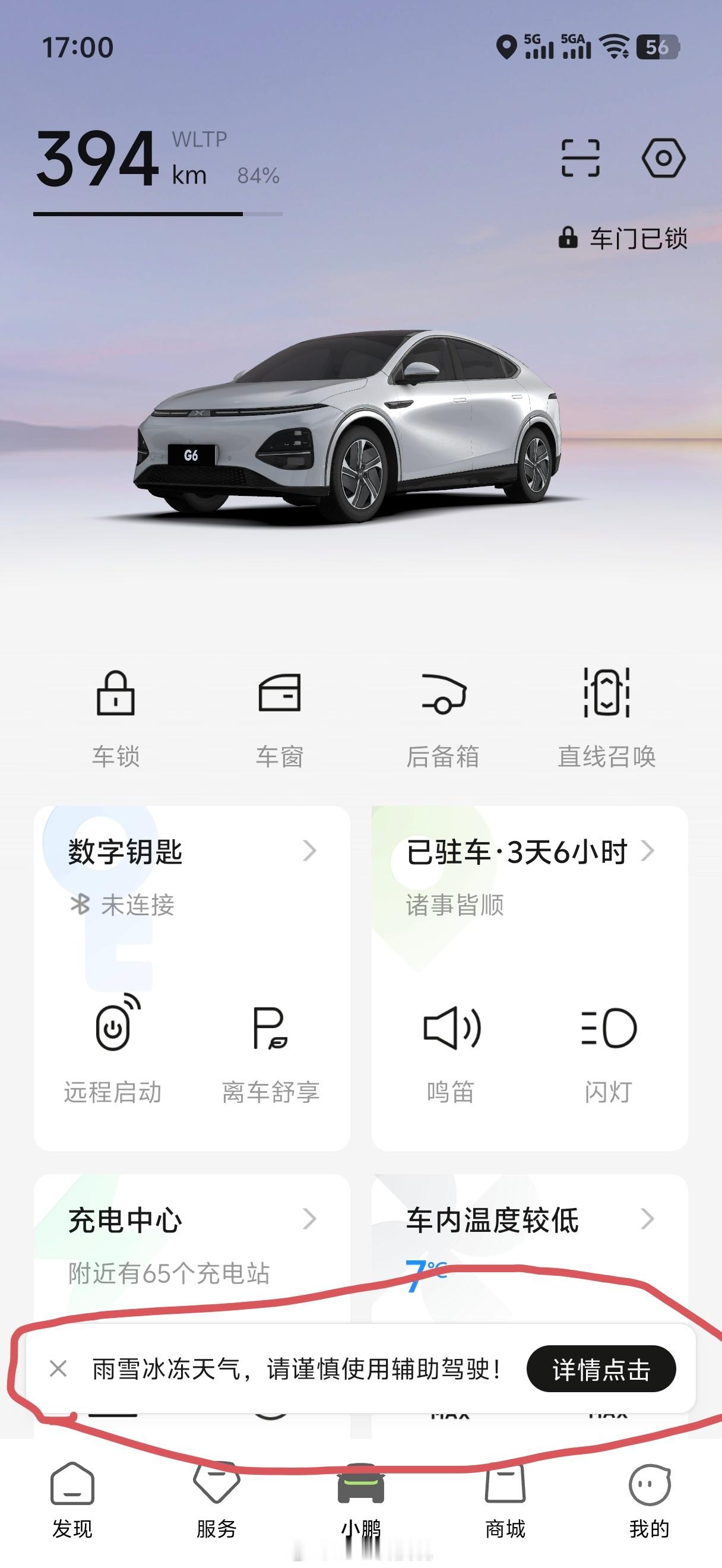 然后小鹏APP就提醒“雨雪冰冻天气,请谨慎使用辅助驾驶”