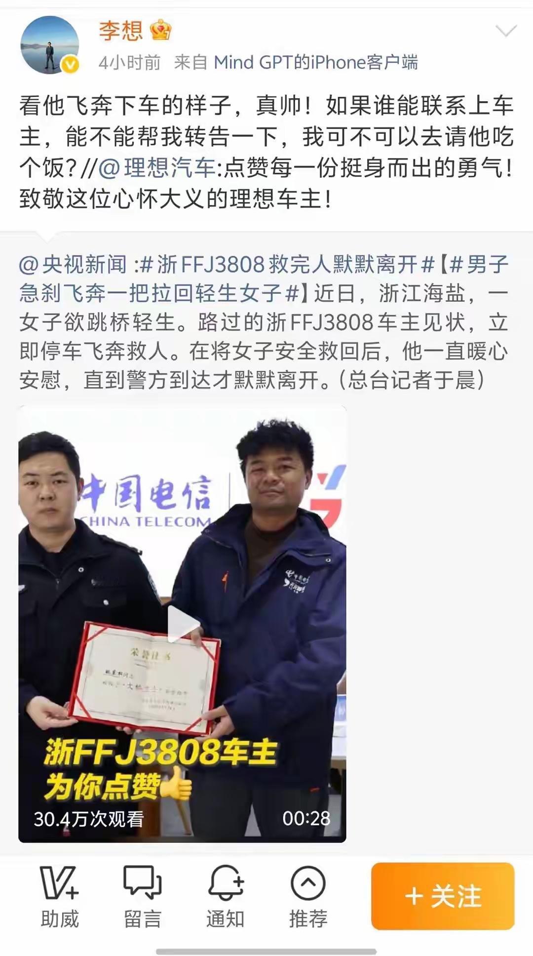 浙江海盐理想车主大桥飞奔救人,理想老板微博说想请这位车主吃饭,一看就没诚意。这名车主叫姚东权,1月的一天驾车经过海盐某大桥,偶然瞥见一个推着行李箱的女子不对劲,马上停车查看,说实话能做到这一步的人非常少,一般人开着车是不会管这个闲事的。姚东权下车见到女子正爬山大桥的栏杆,于是快步冲过去把女子拉下来,救了她一命。李想是看到央视新闻微博发布后转发说了这番话,其实他要是想找到这个车主,直接就可以找到他的电话,根本不需要微博喊话,买车都登记了手机号的。