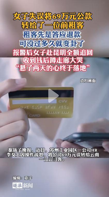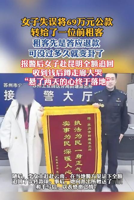 崩溃!苏州一女子误转69万公款给前租客,前租客先是答应退款可没过多久就变卦了,报警后女子赴昆明全额追回,收到钱后蹲走廊大哭:"悬了两天的心终于落地"。之后女子专门为警方送去了锦旗! 近日,苏州一位女子因工作忙碌疏忽,误将公司69万元公款转给了前租客,本以为对方答应退款就能万事大吉,没曾想对方突然变卦,急得她魂不守舍, 最终报警求助,千里奔赴昆明,才成功追回全部款项,收到到账通知的那一刻,她蹲在派出所走廊崩溃大哭,所有的煎熬终于落地。 女子是公司负责款项划转的工作人员,年末工作繁杂,需要同时处理多笔转账,忙得晕头转向。此前她曾将房屋租给过一位租客,退租时办理过押金退还,对方的账号一直存在手机里没删除,也正是这个疏忽,酿成了后续的麻烦。 当天,她在办理公司69万元公款转账时,匆忙间没仔细核对收款信息,误将本该转入公司指定账户的钱,全额转到了这位前租客的账户里。 直到转账成功,她核对明细时才发现出错,那一刻浑身冰凉,大脑一片空白——这不是私人钱财,是实打实的公款,一旦追不回,不仅工作难保,还要承担巨额追偿责任。 女子强压着慌乱,第一时间联系上这位前租客,好在对方一开始态度尚可,听完事情的来龙去脉后,爽快答应会尽快把钱退回来。 得到承诺的女子稍稍松了口气,可没等她放下心来,对方就突然变卦,再也不提退款的事,甚至态度变得抗拒,还提出要当地派出所通知才肯退款。 对方的反悔让女子彻底慌了神,她赶紧联系开户银行,想申请冻结对方账户,却被工作人员告知,银行无法自行冻结他人账户,只能由司法机关出具相关文书才能办理,而对方随时能分批或全额取出款项,资金安全岌岌可危。 情急之下,女子抱着最后一丝希望报警求助,警方核实情况后,确认是工作失误导致的转错账,排除诈骗嫌疑,考虑到69万元数额巨大,且年末资金流动频繁, 一旦对方转移款项,追回难度会大幅增加,当即启动跨省联动机制,对接昆明当地警方和银行,对涉案账户实施临时风险管控,阻断资金转移通道。 与此同时,民警多次联系这位前租客,耐心释法明理,告知其这笔钱属于不当得利,依法必须返还,若恶意占有、转移款项,还可能涉及刑事犯罪。 经过多轮沟通,对方终于松口,同意全额退款,双方约定,由女子前往昆明,在当地警方见证下完成退款,保障资金安全和流程合规。 第二天一早,女子就紧急飞往昆明,一路上内心忐忑不安,既担心对方再次变卦,又害怕出现意外,全程坐立难安。 抵达昆明后,当地警方已在派出所等候,随后在民警的见证下,女子与前租客当面核对转账记录、身份信息等相关材料,确认无误后,对方当场将69万元全额转回公司账户。 当手机弹出款项到账的通知时,女子紧绷了两天的神经彻底放松,当场蹲在派出所走廊里号啕大哭,嘴里反复念叨着“悬了两天的心终于落地”。这场跨越千里的追款,从绝望到转机,再到最终翻盘,两天的煎熬,只有她自己最清楚。 此事被分享到网上后,瞬间引发热议,年末正是转账高峰期,不少网友感慨“太能共情了,换谁都得慌”,也有网友提醒,大额转账一定要反复核对信息,避免因忙碌疏忽出错。 如今,69万公款成功追回,女子也终于摆脱了困境,这场因疏忽引发的风波,也给大家敲响了警钟。对此,你们有什么看法,欢迎评论留言~