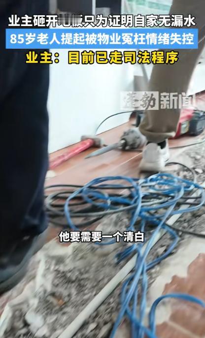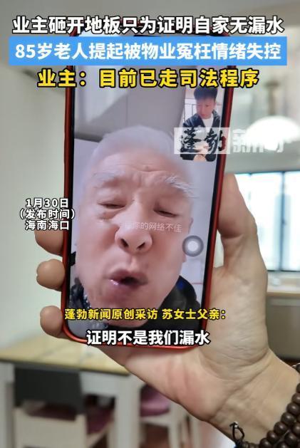 85岁老人为证清白,砸开自家地板。2021年6月楼下渗水,物业未细查即认定老人家漏水,要求老人赔偿,老人受冤心结难解、情绪失控。 谁能想到,一场渗水事件,会让一位八旬老人背负了近五年的 “漏水” 污名,甚至在谈及此事时情绪失控,满心的委屈和无奈无处诉说。 2021年6月,海口某小区里的一户楼下业主发现自家房顶出现了渗水的痕迹,第一时间向物业报了修。 物业工作人员接到报修后,很快来到现场查看,没有做专业的检测,也没有仔细排查公共区域的管道问题,仅仅是简单查看后,就将漏水的责任直接定在了楼上的苏女士家。 而这套房子,当时正由苏女士 85 岁的父亲苏老先生居住,物业不仅认定是老人家室内的隐蔽水管爆裂导致了渗水,还直接通知楼下业主,向苏老先生提出了赔偿要求。 对于一位年过八旬的老人来说,一辈子做人坦坦荡荡,从未与人有过这样的纠纷,明明自己没有做错任何事,却平白无故被认定要为漏水负责,还要赔偿邻居,这份冤枉像一块石头,重重压在了老人的心上。 得知此事后,苏女士立刻赶回来处理,她始终坚信自家的水管不可能出现问题,因为这套房子是2009年购买,2010年完成的装修,入住后一直正常使用,从未有过漏水的情况。 2021年11月,苏女士特意找到了十多年前为自家装修的施工队负责人,花费 300 元请专业工人到家中,对室内的所有水管进行了专业的压力测试。 测试结果很明确,家中的地板下水管没有任何破损,也不存在任何渗漏的痕迹,这份检测结果,本应是洗清冤屈的证据,可当苏女士拿着结果与物业沟通时,却遭到了物业的直接否定。 物业依旧坚持自己最初的判断,认定漏水的原因就是苏女士家的管道问题,对于专业的检测结果视而不见,这份强硬的态度,让苏女士一家人的委屈又多了几分。 在后续的日子里,苏女士并没有放弃寻找真相,她在排查中发现,小区公共过道的管井天花楼板存在漏水情况,漏水的水还会通过管道流入室内,而这一发现,当时小区物业的电工也在场亲眼看到。 在铁证面前,物业的态度终于有了一丝松动,2022年12月,物业公司认可了苏女士家中并没有出现渗水的情况,还表示可以将此前300元的检测费从停车费中抵扣,2024年年初,物业公司的一名负责人再次上门检查后,也明确承认了这是物业的责任。 苏女士一家人本以为这件事终于可以尘埃落定,他们向物业提出了减免物业费作为补偿的诉求,可谁也没想到,物业公司更换工作人员后,之前的认定全部被推翻。 新的工作人员不仅再次否认了公共区域漏水的责任,拒绝减免物业费,还开始不间断地向年迈的苏老先生催缴物业费,这份出尔反尔的做法,让老人的心理负担越来越重,本就因被冤枉而心结难解,如今更是寝食难安。 为了彻底证明自家的清白,让父亲能放下心中的芥蒂,不再被这件事困扰,2026年1月26日,苏女士做出了一个艰难的决定,砸开家中的地板,将埋在地下的隐蔽水管全部挖出来,用最直观的方式证明一切。 工人用钻机一点点敲开客厅的地板,随着地板被掀开,埋在混凝土下的水管逐渐露出了全貌,施工队负责人现场进行了仔细检查,确认水管管体完整无损,没有任何破损和裂缝。 在通水的状态下,也没有出现任何渗漏的现象,水管所经过的混凝土区域,也都是干燥的状态。 现场的公证人员、社区网格员和施工单位负责人,都共同证明了苏女士房内的水管不存在任何渗漏问题,地板砖的表面也没有任何色差,足以说明从装修入住至今,地板一直保持完好,从未有过被撬动或维修的痕迹。 这份迟到了近五年的 “清白证明”,终于摆在了眼前,可当苏女士带着这份结果再次与物业沟通时。 物业虽然承认了苏女士家的管道没有漏水,却对于 2021 年那次楼下渗水的真正原因含糊其辞,始终没有给出一个明确的说法,也没有对这五年给苏老先生造成的心理伤害有任何的歉意。 而苏老先生在谈及这五年来被冤枉的经历时,再也忍不住心中的情绪,悲痛又无奈地反复说着 “这个物业,我们毫无办法,我真的很痛苦”。 如今,苏女士已经在 2026 年 1 月 26 日,向法院提起了民事诉讼,要求物业公司为自己的失职行为道歉,承担此次事件的全部责任,并赔偿一家人因此遭受的各项损失。 法院已经受理了此案,这场因物业未细查就定责而引发的纠纷,终于走进了司法程序。 这场纠纷从来都不只是一场简单的漏水争议,它关乎普通人的清白与尊严,关乎物业行业的责任与底线。 愿每一份坦荡都不被辜负,每一次冤屈都能得到昭雪,也愿所有物业都能坚守初心、履职尽责,不再让类似的遗憾,降临在每一个平凡人身上。 对于这件事,您有什么想说的吗?欢迎评论区留言讨论。 信源:蓬勃新闻2026-01-30——《85岁老人提起被物业冤枉情绪失控,业主女儿砸开地板只为证明自家清白》
