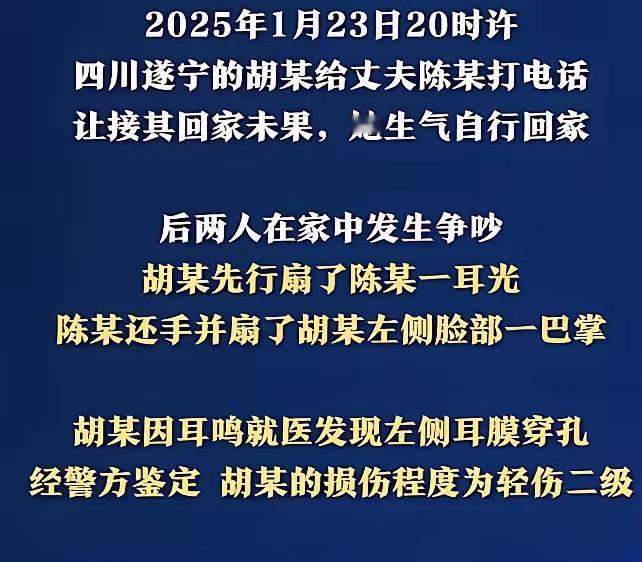 “冤到家了!”四川遂宁,一女子嫌丈夫不开车接自己下班,一耳光扇丈夫脸上,丈夫也不是吃素的,反手也给了女子一巴掌,直接把女子打得耳膜穿孔,构成轻伤2级,女子愤怒报了警,丈夫被判故意伤害,但丈夫却认为,自己属于防卫过当。法院竟然判丈夫拘役6个月,丈夫傻眼了,这打老婆的后果咋这么严重? 胡女士加班到晚上8点多,又累又饿,她实在不想挤公交车,她看了一下时间,此时丈夫正好在家没事,她就给他打电话,想让他开车来接自己。 可让胡女士始料不及的是,她站在寒风里,给丈夫打了好几个电话,他竟然不接。 可把胡女士气坏了,她猜测丈夫一看她这个时间给他打电话,肯定是想让他开车去接她回家,所以,他懒得动,所以故意不接自己电话。 胡女士憋了一肚子气,气鼓鼓回到家,看到丈夫陈先生在家,立马上去跟他吵了起来。 这时,陈先生才知道妻子给自己打了好几个电话,但手机静音他没听见。 陈先生给妻子做了解释,可她却不依不饶,陈先生也火了,说他也工作了一天,累的快散架了,就这么点小事,胡女士没完没了,烦不烦呀?不愿意坐公交,就打车,凭啥他必须随叫随到? 本来就气不打一处来的胡女士。一听丈夫不接电话还有理了,立马火冒三丈,直接失去理智,扑上去就给了丈夫一耳光。 按理说,女人也没多大的劲,这一巴掌疼不到哪里去,如果陈先生度量大一点,不跟妻子计较,说几句软话,这事就过去了。 但陈先生对妻子的胡搅蛮缠,小题大做,感觉很恼火,竟然也没惯着她,反手就给了妻子一耳光。 男人的力度多大呀,这一巴掌,直接把胡女士打得眼冒金晶,晕头转向,第二天早晨,胡女士感觉耳鸣,嗡嗡作响。 胡女士怀疑丈夫这一巴掌把自己耳膜打穿孔了,她去医院一看,果不其然,构成了轻伤二级。 胡女士怒火中烧,既然你薄情寡义,那别怪我无情无义了,胡一怒之下报了警。 结果,陈先生被法院认定为故意伤害,陈先生没做辩解,认罪认罚,但他的律师认为,陈先生属于正当防卫,只不过防卫过当了点,不构成故意伤害。 这事说起来真的很让人唏嘘,本来就是一件鸡毛蒜皮的小事,最后闹到丈夫坐牢、妻子伤心的地步。 先说说这个丈夫,妻子扇耳光固然不对,但作为男人,哪怕当时再生气,也不该下这么重的手。要知道一巴掌打穿耳膜,可不是简单的打疼了,那是实打实的轻伤,已经触碰了法律红线。 他以为是“还手”,但在法律眼里,这就是故意伤害。退一步说,就算要还击,也该有个度,推搡一下制止冲突就行,何必非要用那么大力气扇回去?真要是打坏了人,不管对方是谁,都要负责。 再说说妻子,她也有点得理不饶人。丈夫没接电话可能真的是没听见,就算生气,回家好好说不行吗?非得先动手扇耳光,把小事闹大。 最后丈夫被判刑,她心里估计也不好受,毕竟是自己的老公,真的坐了牢,这个家也就散了一半了。 其实很多家庭矛盾都是这样,本来没多大事,就因为双方都不肯退让,非要争个输赢,最后把事情越闹越大。 夫妻之间哪有那么多对错?真要较真,赢了道理,输了感情,得不偿失。而且就算是家人,动手打人也是不对的,尤其是造成了伤害,一样要承担法律责任。 另外,这个判决也给所有家庭提了个醒:冲动是魔鬼,不管再生气,都不能动手打人。就算是自卫,也要把握好度,否则很容易从“受害者”变成“加害者”。 依据《刑法》第20条,正当防卫需针对正在进行的不法侵害,且以制止侵害为目的。 本案中妻子的耳光属于轻微不法侵害,丈夫反手力度远超必要限度,且主观上是出于报复而非制止冲突,不符合正当防卫的核心要件,因此被认定为故意伤害。 虽有自首与认罪认罚情节,但造成轻伤二级后果,仍需承担刑事责任。 但最终,法院还是判决陈先生故意伤害,拘役6个月。 对此你怎么看?