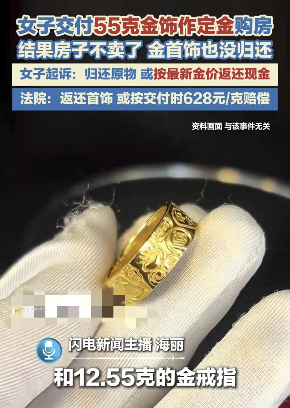 一女子为了买房,将自己拥有的42.75克金向量和12.55克的金戒指作为定金交给男方。而如今男方却反口说传子不卖了,但是金首饰也没返还给女方,于是女子将男子诉至法院,要求返还黄金首饰,或者是按照现在的金价折现返还给自己。法院判定要求男子归还原物,或者是按照当时交付的628元的金价返还现金给女子。