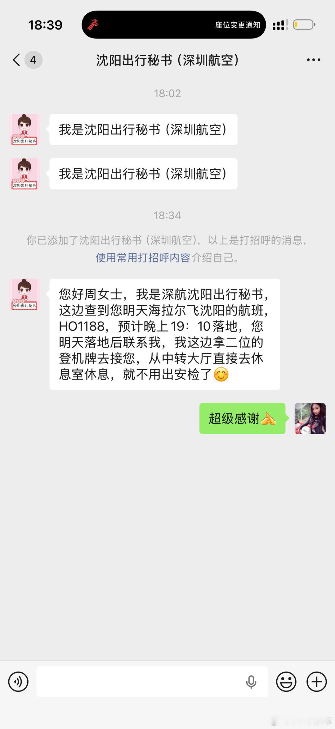 深航的服务怎么说呢,应该就是放在国内当之无愧排第一的那种~明天从海拉尔回深圳,在沈阳中转,选了个安全出口的座位无法使用电子登机牌,本来会需要出安检打登机牌,再重新安检结果深航秘书打电话来,告诉我落地后微信联系她,她会拿纸质登机牌来我下飞机的那儿接我,这样我就不用出去又安检一次了只能说深航太体贴了深圳航空