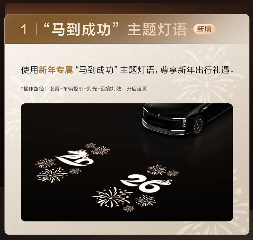 尊界这边的专属OTA有点意思,马年主题灯语设计的很棒,挥手关门现在也可以关另一侧的门了,还有ARHUD新出了车道指引,都是很实用的东西。