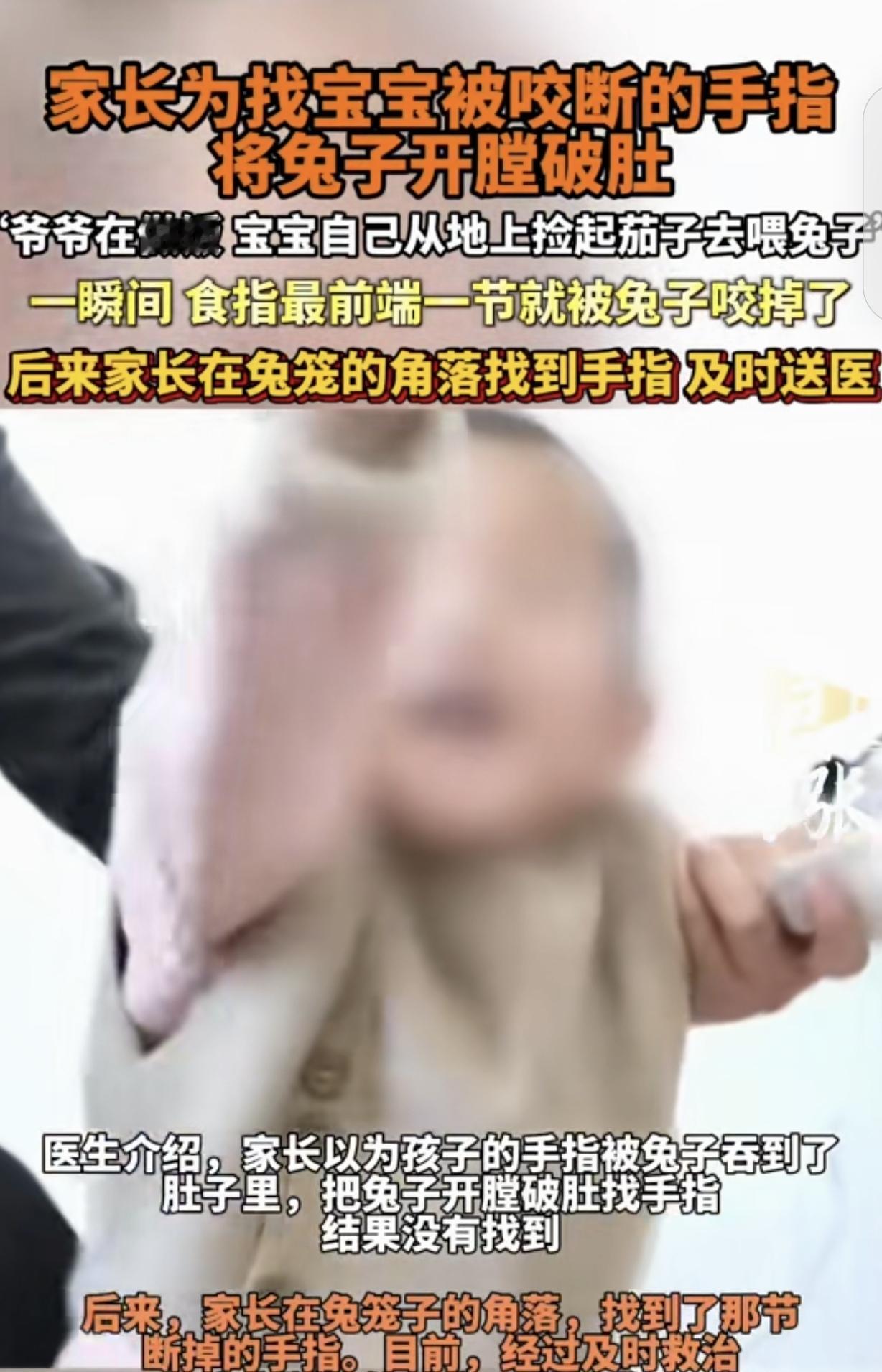 “悲剧了!”河南,一岁多宝宝捡起地上的茄子,去喂兔子,不料食指却被兔子咬去一截,家人以为,宝宝的手指被兔子吞进肚子里,就把兔子肚皮割开,竟没找到手指,结果在笼子边找到了,兔子白死了,但宝宝的断指接上后顺利成活。网友:小时候,大人就嘱咐兔子急了会咬人。 据1月30日浪涨新闻报道,一岁多的小宝的爷爷奶奶,在厨房里做饭,他自己在院子里玩耍。 小家伙长得白白胖胖,一双大眼睛滴溜溜地转,对啥都充满了好奇。 院子里有个小笼子,里面养着着一只毛茸茸的兔子。那兔子浑身雪白,耳朵长长的,红红的眼睛就像两颗小宝石,三瓣嘴一动一动的,非常可爱。 小宝被这只兔子吸引住了,时不时就会凑到笼子边,眼巴巴地看着它,嘴里还“咿咿呀呀”地说着谁也听不懂的话。 爷爷奶奶在厨房里忙活着做饭,也没顾得上小宝,他们也大意了,觉得在自家院子里,也没啥危险。 小宝贝在院子里自己玩着,突然,他看到了地上有一根茄子,那是早上奶奶买菜时掉下来的。 小宝贝像是发现了新宝贝一样,摇摇晃晃地走过去,弯腰把茄子捡了起来。 他拿着茄子,一步一步地朝着兔子笼子走去。到了笼子边,小宝贝把小手从笼子的缝隙里伸进去,想把茄子喂给兔子吃。 那兔子看到有东西伸进来,张嘴就咬。只听“啊”的一声,小宝贝疼得大哭起来。 原来,兔子这一口没咬到茄子,却把小宝贝的食指咬去了一截,顿时血流如注。 爷爷奶奶在厨房里听到小宝贝的哭声,心里“咯噔”一下,赶紧放下手里的活,三步并作两步地跑了出来。 当他们看到小宝血肉模糊的食指,顿时慌作一团,这才发现,孩子食指没了一截。 老两口吓得脸色煞白,腿都软了,儿子儿媳回来咋跟他们交代呀? 爷爷一把抱起小宝贝,奶奶则在一旁急得直跺脚,嘴里不停地念叨着:这可咋办呀,这可咋办呀! 一家人急得像热锅上的蚂蚁,赶紧到处找断指,如果找到断指及时去医院接,也许还来得及。 可他们到处翻找,却没找到,会不会被兔子吞进肚子里了? 看着小宝贝疼得直哭,为了能尽快找到断指去医院接上,爷爷奶奶无奈地拿起刀,把兔子宰了。 他们颤抖着双手,剖开兔子的肚皮,在里面翻找着,可是找了好半天,也没找到那截断指。 最后,大家在笼子边找到了那截断指,可兔子已经没了气息,白死了。 好在送医及时,宝宝的断指接上后顺利成活。有人说,小时候大人就嘱咐“兔子急了会咬人”,看来真不是随便说说的。以后照顾孩子,可真得时刻小心,不能有半点疏忽啊! 这事真的让人又心疼又无奈,心疼宝宝受了罪,也可惜了那只兔子白死了。 先说爷爷奶奶,他们其实也挺冤的。自己在厨房做饭,以为孩子在院子里玩能放心,谁知道会出这档子事。 发现孩子手指被咬断后,他们急得六神无主,满脑子都是赶紧找到断指救孩子,甚至不惜杀了兔子。那种慌乱之下的决定,真的没法苛责太多,换成任何一个家长,估计都会慌不择路。 但也得说,他们确实疏忽了,哪怕留个人在院子里看着孩子,也不至于发生这种事。 那只兔子,它本来就是出于本能反应,闻到食物的味道就咬,哪知道咬到的是孩子的手。结果就因为大人的慌乱,无辜丢了性命,想想真的挺可怜的。 其实兔子咬人真不是什么新鲜事,老一辈人早就说“兔子急了会咬人”,这可不是随便说说的。别看兔子平时温顺,真急起来发起狠来也挺厉害的。 还有这个宝宝,真的太遭罪了。那么小的孩子,被咬掉一截手指,想想都疼。好在最后断指接上了,不然这辈子都要带着这个遗憾了。 这件事也给所有家长提了个醒:带孩子真的不能有半点马虎,哪怕一分钟没看住,都可能出意外。不管是家里的宠物还是外面的东西,都有可能对孩子造成伤害。 其实养宠物的家庭更要注意,不能让宠物和孩子单独相处太久,尤其是像兔子这种看起来温顺但其实有野性的动物。 平时也要教孩子怎么和宠物正确相处,不能随便用手去喂,更不能去逗弄宠物,不然真的很容易被伤到。 《民法典》第1245条规定,饲养的动物造成他人损害的,动物饲养人或者管理人应当承担侵权责任,但能够证明损害是因被侵权人故意或者重大过失造成的,可以不承担或者减轻责任。 本案中,因监护不当致幼童主动投喂被咬伤,监护人存在重大过失,需自行承担主要责任。 对此,你怎么看?