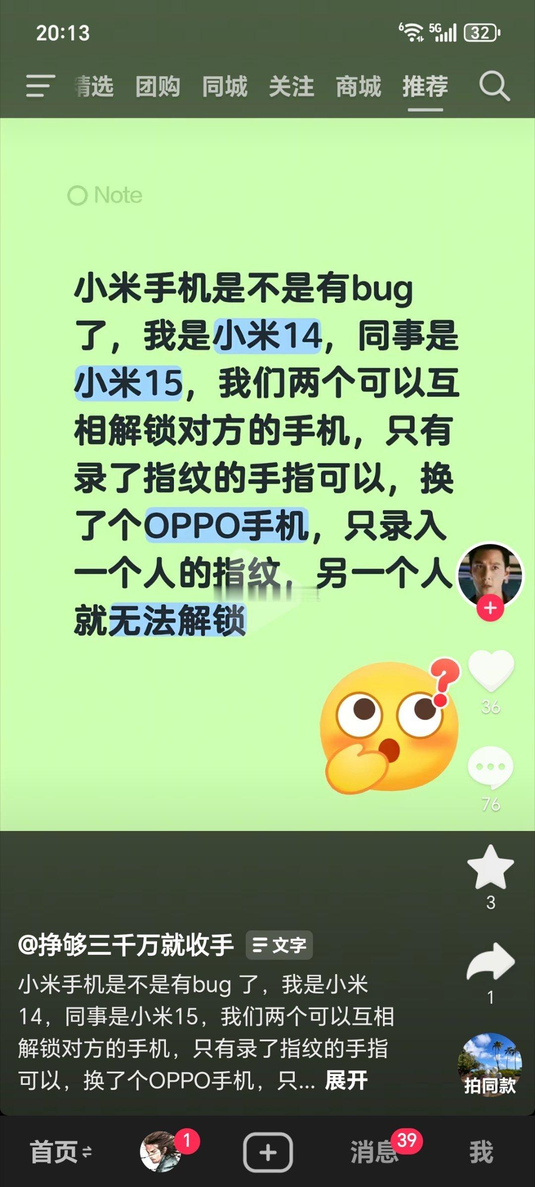 自己的小米14手机,同事的小米15手机,可以互相解锁对方手机,录了指纹就可以