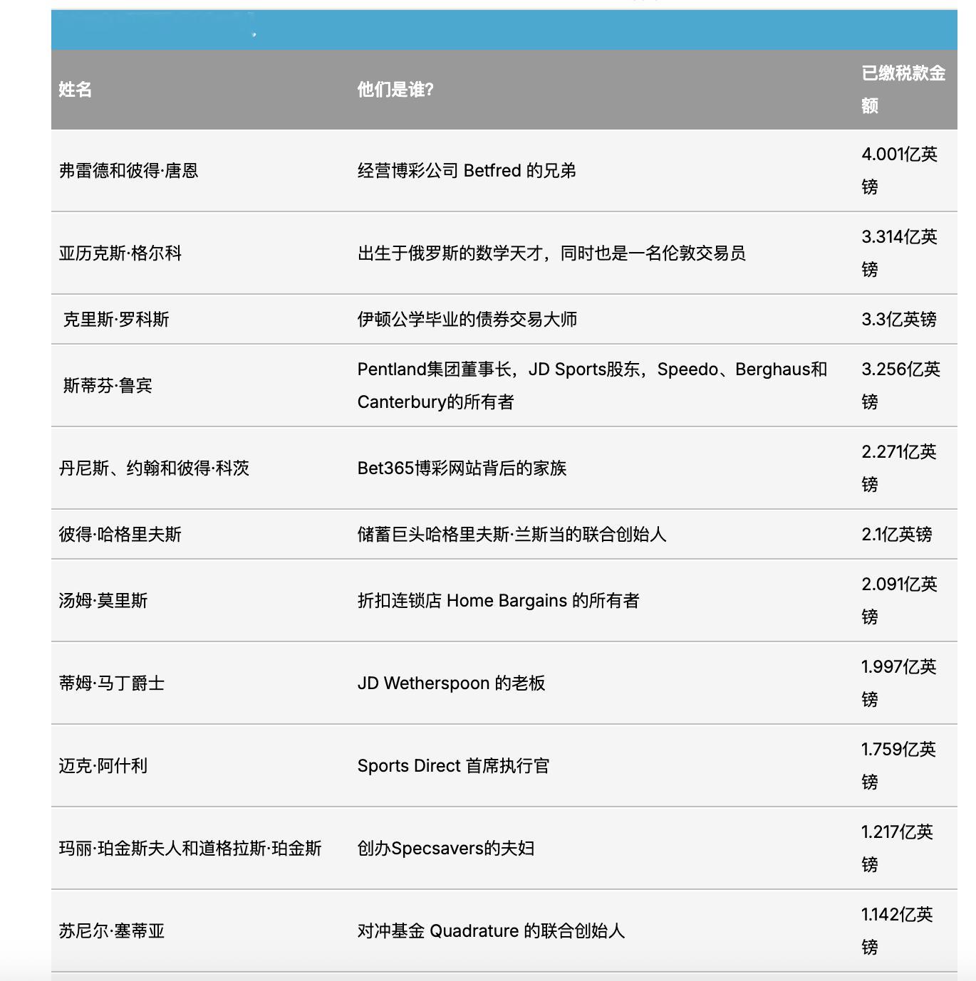 英国纳税大户名单揭晓:赌博业巨头以4亿英镑的税单位居榜首,英超球星与哈卷-哈里·斯泰尔斯、J·K·罗琳和安东尼·约书亚一同跻身前100名。《星期日泰晤士报》2026 年税务清单显示,英国前100名 纳税大户在过去一年中向财政部缴纳了总计 57.58 亿英镑的税款,博彩业创始人弗雷德·唐恩和彼得·唐恩首次位居榜首,据估计,他们在 12 个月内缴纳了 4.001 亿英镑的税款,比一年前的 2.734 亿英镑大幅增长。这对兄弟于1967年创立了Betfred,公司总部至今仍设在柴郡沃灵顿。他们的巨大贡献使他们超越了对冲基金和金融界人士,后者占据了前20名中的绝大部分席位。