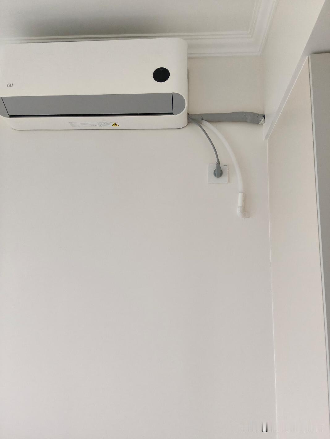 被空调机安装师傅硬控了。 插座一根线,铜管一根线路,冷凝水排水管一根线路,兵分三家,各走各的。 这安装太绝了! 求大神支招,该怎么遮丑?