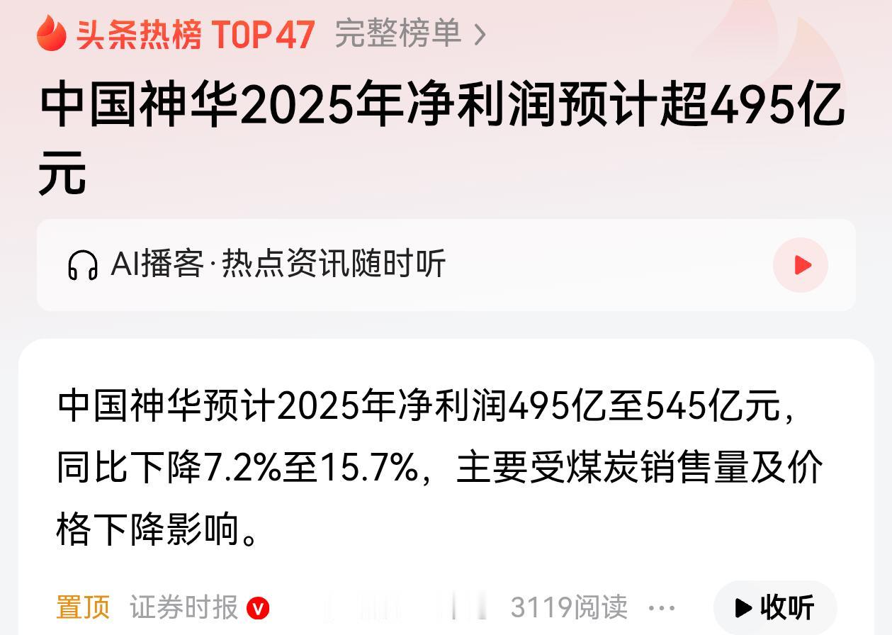 煤电的利润还是高啊, 中国神华2025年净利润预计超495亿元,注意是净利润!随着人工智能发展,电力未来将需求更多,ai的尽头就是电力能源的比拼,所以国内风电,水电,媒电和太阳能发电都在多条腿走路,未来借助高压传送和储能的发展,电力就是新的货币锚点!