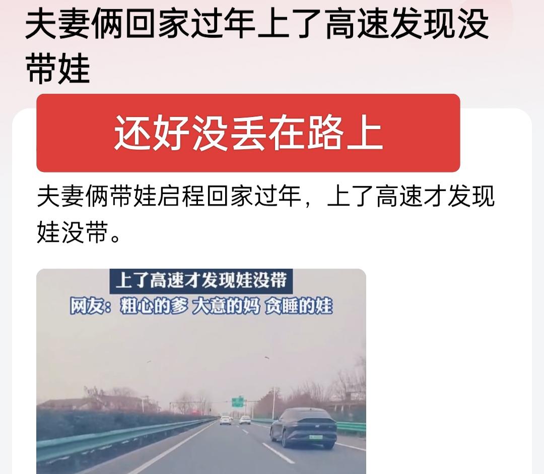 粗心的爹,大意的妈,上了高速才发现没有贪睡的娃,这是归心似箭呀!车上了高整才察觉不对劲,车厢里安静得反常,才猛地反应过来,家里那只小神兽居然没带上! 这事儿也给所有过年回家赶路的人们提个醒,出发前多核对几遍,娃呀,证件呀,宠物呀,各种随身行李都查一查,别光顾着赶路,把重要物品给落下了,平安回家,才是最踏实的团圆。