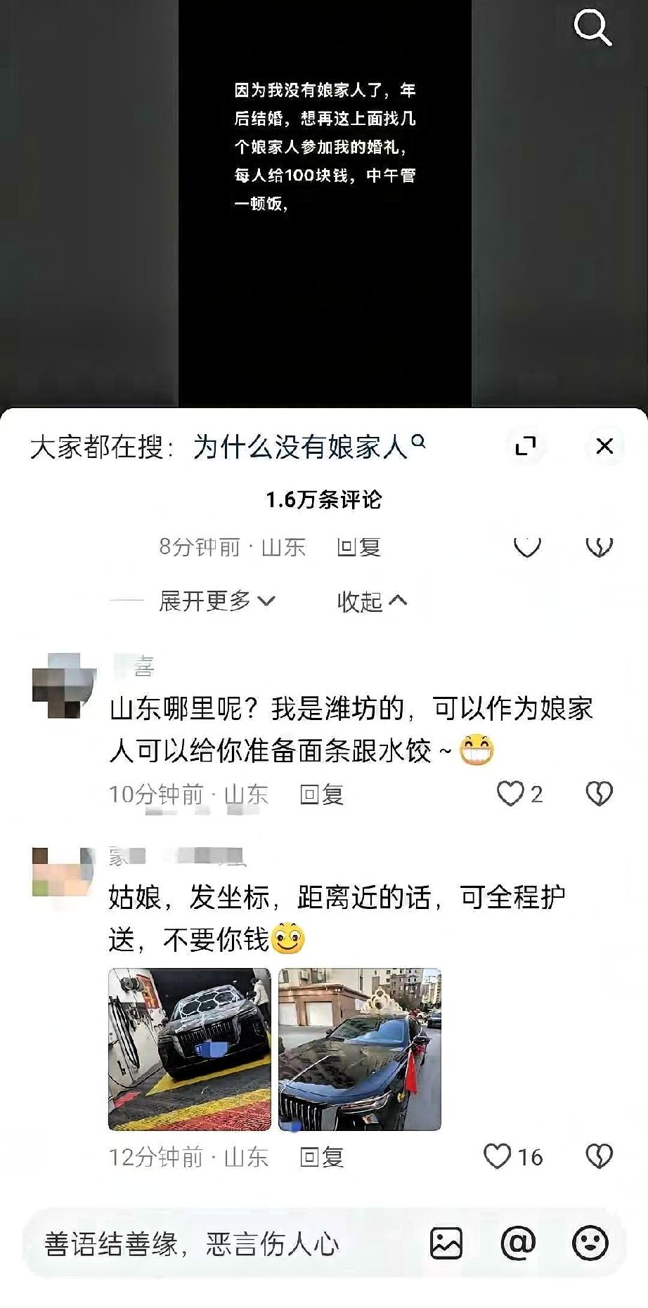山东女孩即将结婚,因为没有娘家人,发帖寻求娘家人一起参加她的婚礼,还承诺给每位帮忙的人100元红包,中午管一顿饭。 这条简单的求助信息发出后,评论区很快被山东各地的网友刷屏。潍坊的网友主动询问姑娘的具体位置,表示可以按当地结婚风俗,提前准备好面条和水饺;有网友直接晒出自己的车辆照片,让姑娘发坐标,只要距离不算远,婚礼当天就免费全程护送;还有不少人留言说,愿意帮忙招呼宾客,绝不让姑娘在婚礼上受委屈。 短短时间里,就有16000多位网友留言回应,大家都争着要当姑娘的娘家人,没有一个人提红包和吃饭的事,满屏都是真心实意想帮忙的热情。 其实生活里,总有人感慨人情淡薄,但这件事却让人看到了不一样的温暖。血缘从来不是定义家人的唯一标准,这些素未谋面的陌生人,用最实在的行动,诠释了什么是仗义与真诚。姑娘的坦诚直白,网友的热心不图报,这样的双向奔赴,比任何奢华的婚礼都更有意义。 这就是山东人的实在,也是咱们普通人之间最朴素的善意。一句“我来当你娘家人”,不仅能让姑娘的婚礼更圆满,也能让这份温暖被更多人看见和传递。