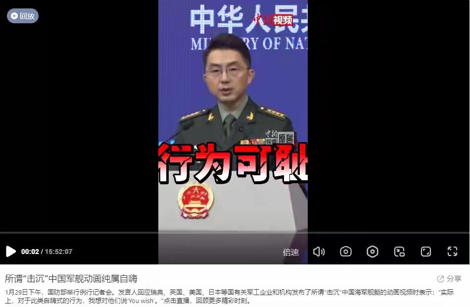 4国动画演击沉中国军舰,中方一句英文回怼:伤害性不大,侮辱性极强 美英日瑞四国军工企业,靠CG动画演“击沉中国军舰”,特效拉满却全是自嗨,本质是借挑衅炒热度、卖武器。国防部记者会上,蒋斌大校没长篇驳斥,只淡淡一句You wish(想得美),四两拨千斤,把这场闹剧戳得粉碎。 这波操作看着唬人,实则虚张声势。真刀真枪的实力,不是动画能演出来的;中国海军的底气,更不是几句模拟能动摇的。瑞典已悄悄撤下视频,就是最好的证明——靠舆论挑衅碰瓷,终究站不住脚。 中方的回应,是自信更是清醒:不搞情绪化对抗,不陪无意义炒作,用实力说话,用定力破局。你们演你们的,我们发展我们的,谁也别想靠虚招干扰中国的强军步伐。 锐利焦点:动画演得再真,也改不了实力差距。一句“You wish”,是不屑更是底气。你觉得这波回怼够不够解气?靠动画碰瓷的把戏,还能骗多久?评论区聊两句!外国军舰挑衅