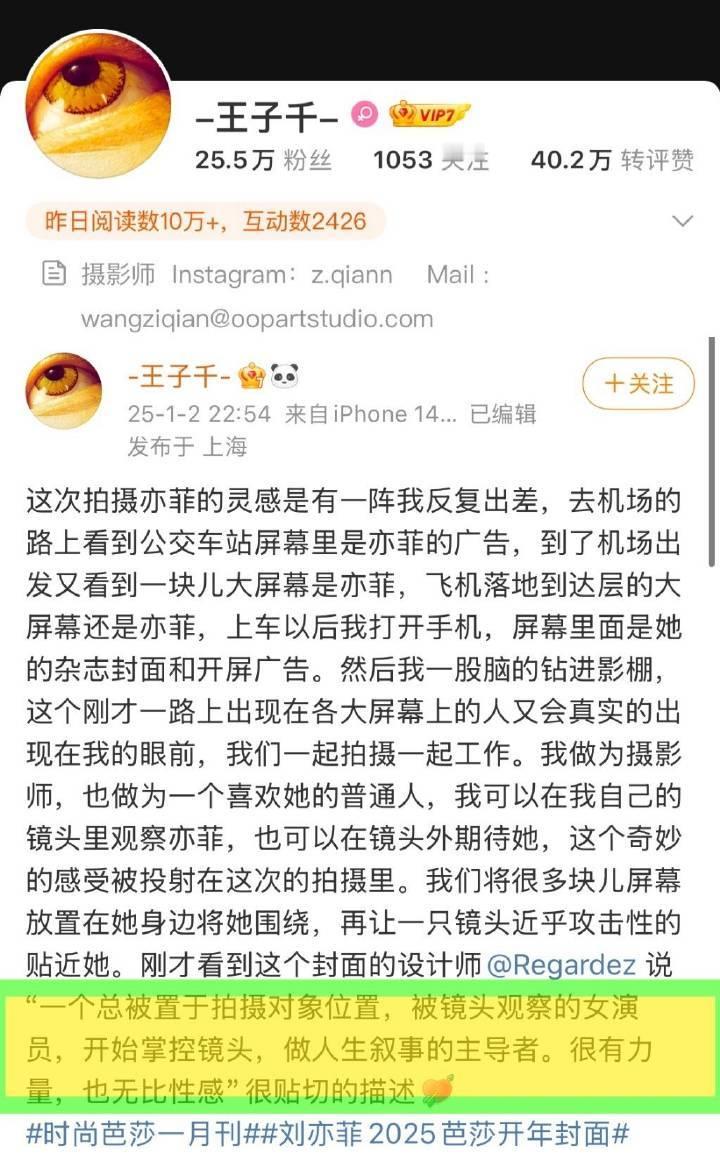 还记得2025年的开年合作,芭莎主编设计师们全员在线鼓掌👏🏻,看得出来,跟刘亦菲合作是件很愉快轻松的事情~