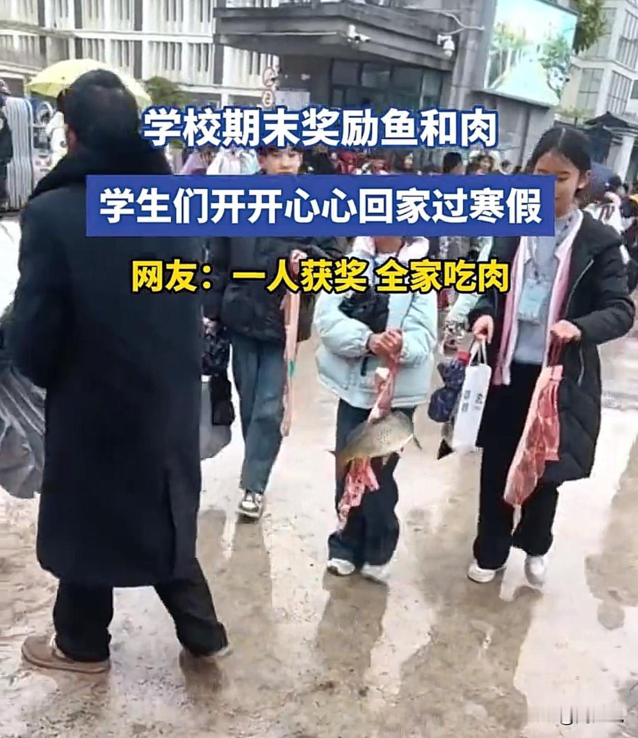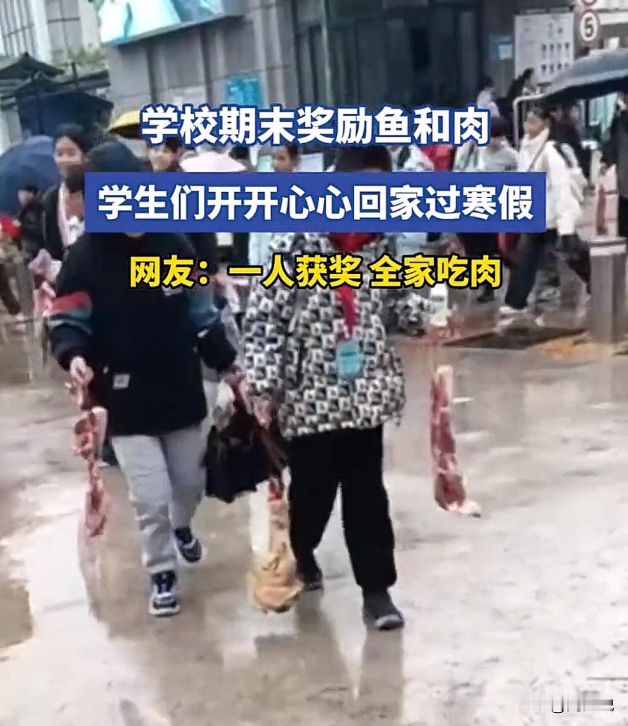 “这期末奖励太硬核了!”刷到一个视频,一所学校的期末奖励,直接把快乐值拉满,不发奖状不送习题,直接奖励鱼和肉,学生们抱着沉甸甸的鱼肉,脸上笑开了花。据了解,为了鼓励孩子们一学期的努力,学校别出心裁,用新鲜的鱼和肉当奖品,让获奖的喜悦直接飘进家家户户的厨房。 此视频曝光后,网友们也纷纷点赞:“这奖励太实在了!一人获奖,全家吃肉,幸福感爆棚!” 还有网友更是坦言:“比起奖状,这波接地气的奖励,孩子记一辈子!” 周少想说这份“硬核奖励”,跳出了传统表彰的固定框架。比起冷冰冰的荣誉证书,看得见、吃得到的鱼肉,更能让孩子感受到努力的“甜”,也悄悄拉近了家校之间的距离。 可见,教育不一定非要端着架子,偶尔换种接地气的方式,或许能收获意想不到的效果。毕竟,能让孩子笑着把努力变现,又能让家长感受到教育温度的举措,很难不被人记住。 这样的奖励方式,值得称赞。#寻美三湘# #长沙新朋友#
