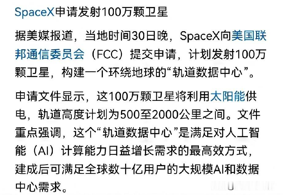 马斯克又出招了! 星球大战已经开启, 马斯克的SpaceX公司申请发射100万颗卫星,构建全球网络,极大的提升美国在太空的先发优势和数据掌控能力。这并不是马斯克和美国唯一的布局,近期,中国也申请了20万颗卫星的轨道。 马斯克联合美国先发布局500公里到2000公里之间的轨道卫星,如果成功,将构建一个环绕地球的超级数据中心。 毫无疑问,这将是美国最强有力的在太空的“数据武器”,甚至可以摧毁所有依赖卫星信号的导弹、无人机、航母、战机等,构建超级卫星战体系。 可怕的是,如果美国率先在太空展开卫星战,对未来的任何一场战争,都将产生巨大的影响。这个威胁,必须高度警惕!