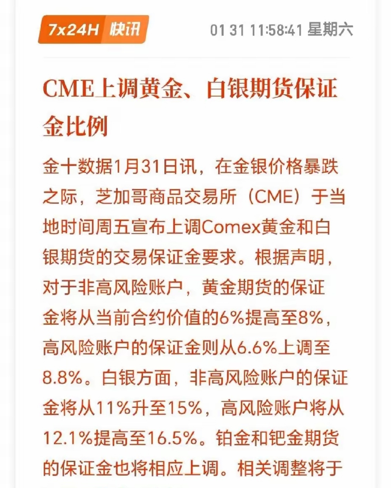 金价波动重磅:CME周末提黄金和白银保证金!最新消息,提保,下周一收盘后生效。包括黄金、白银、铂、钯。其中,黄金从6%提高至8%,高风险账户6.6%上调至8.8%。白银,从11%升至15%,高风险账户将从12.1%提高至16.5%。黄金提2%。白银提4%。小打小闹,提的不多。周五史诗级行情,有人盆满钵满,有人爆仓亏光。唱多的消失了80%。黄金白银