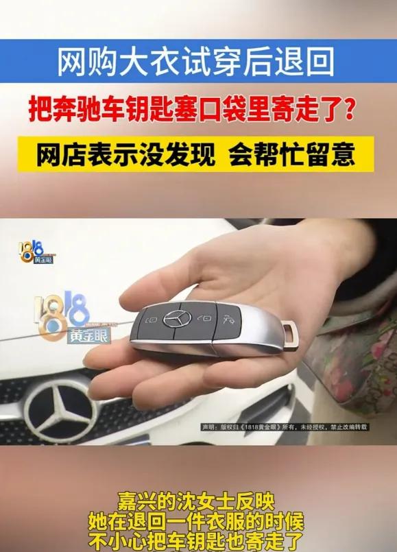 嘉兴女子的粗心太闹心! 150元大衣退货竟把奔驰钥匙塞进口袋,寄回后商家称没见过,大衣还被直接发走,6000多的配钥费成了烫手山芋,这事儿看得人直替她着急! 沈女士试穿大衣随手放钥匙,退货时忘拿,寄件1.69kg比收货重了0.48kg,这成了她认定钥匙寄到商家的铁证。可商家仓库无监控、整理退货不查口袋,还把大衣二次寄出,一边推脱一边无法自证,双方各有说辞,钥匙至今杳无音信。沈女士自认有疏忽,但也觉得商家未尽检查义务,如今只能天天打车,悔不当初。 这事儿也给所有人提了醒,退货前一定要仔细检查物品,贵重物品更要多留心;而商家处理退货也该更细致,多道检查流程才能避免这类麻烦。小疏忽酿出大麻烦,两方的问题终究让一人扛了苦果。 你觉得这把钥匙的丢失,商家该承担多少责任?大衣洗坏