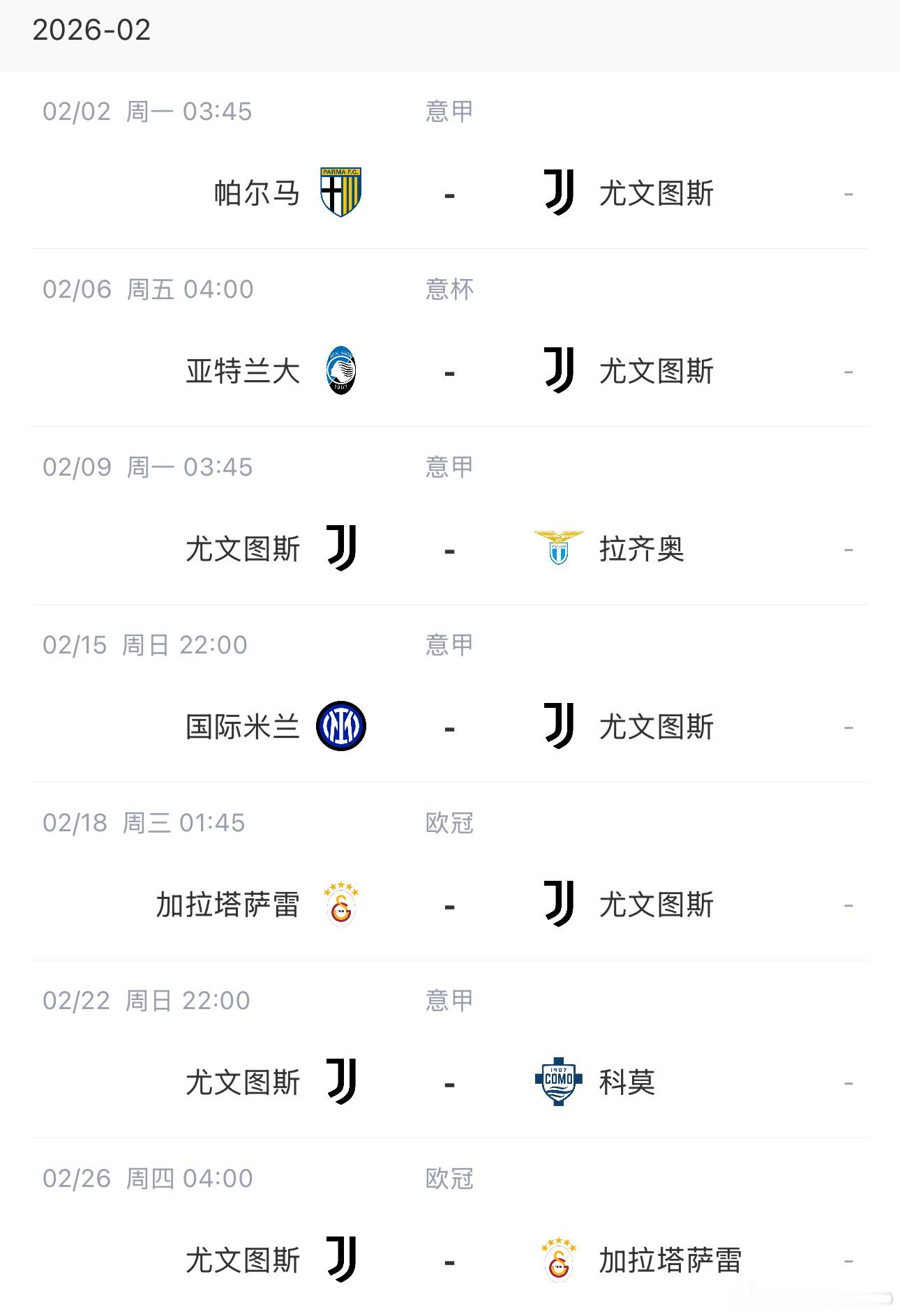 2月18日(大年初二) 01:45 加拉塔萨雷 vs 尤文图斯2月26日 04:00 尤文图斯 vs 加拉塔萨雷
