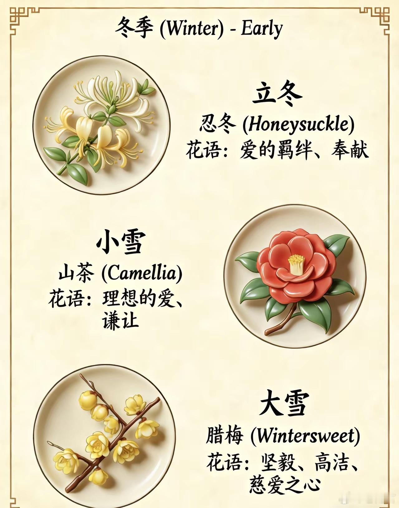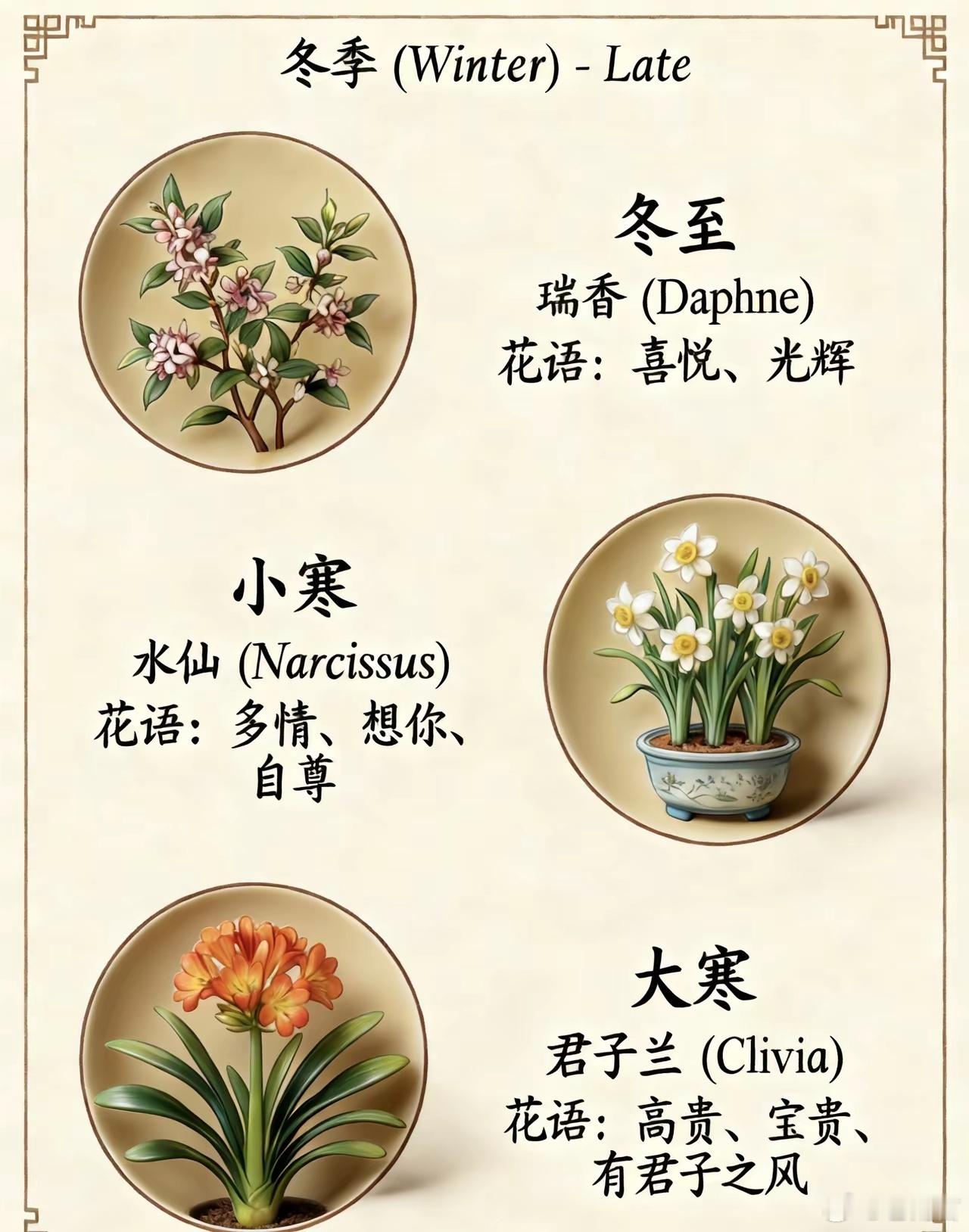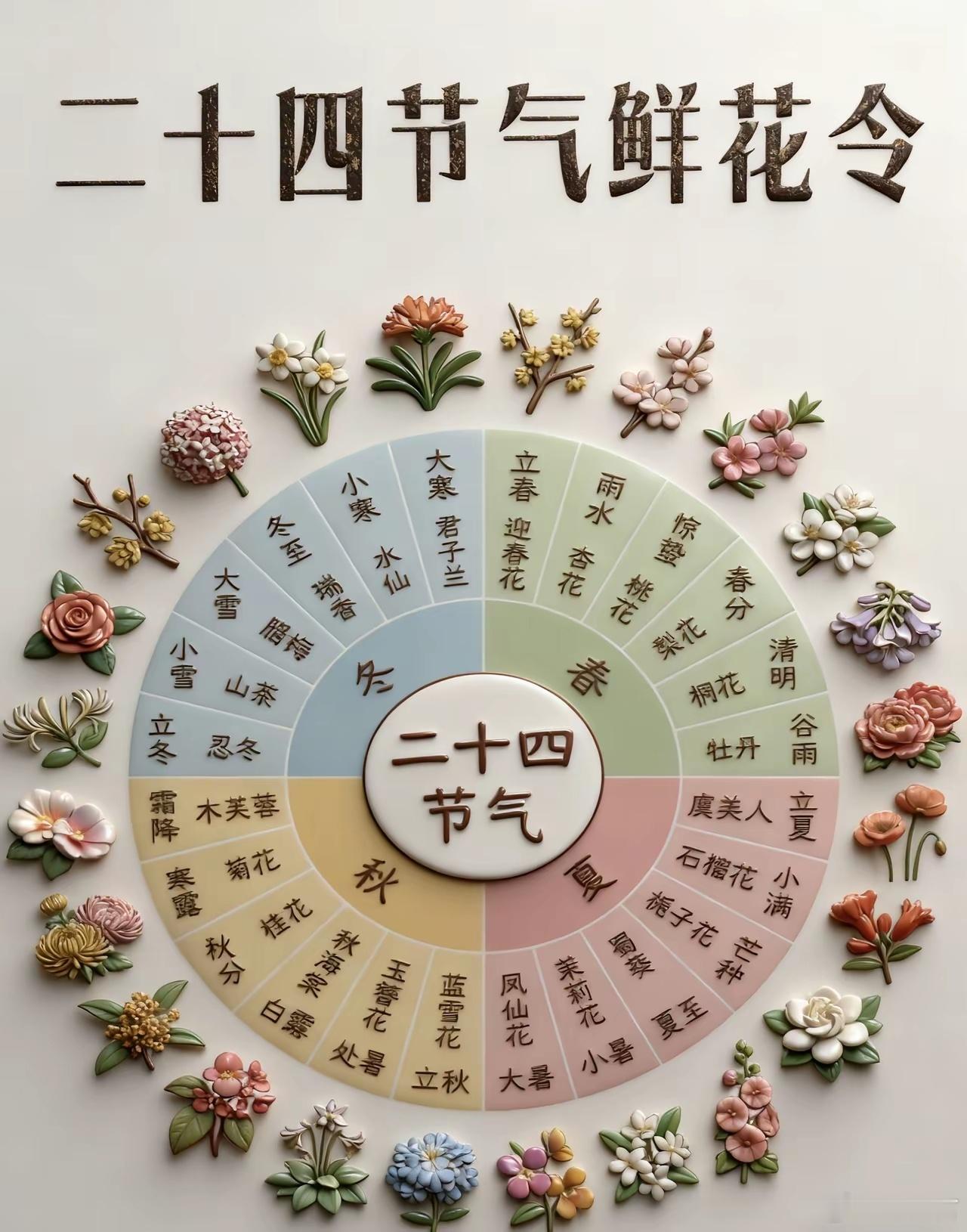 二十四节气鲜花令春季(Spring)- Early• 立春:迎春花(Wintersweet)花语:希望、坚强、活力• 雨水:杏花(Apricot Blossom)花语:娇羞、疑惑、少女的慕情• 惊蛰:桃花(Peach Blossom)花语:爱情的俘虏、宏图大展春季(Spring)- Late• 春分:梨花(Pear Blossom)花语:纯洁、纯情、永不分离• 清明:桐花(Paulownia)花语:迟到的爱• 谷雨:牡丹(Peony)花语:圆满、浓情、富贵夏季(Summer)- Early• 立夏:虞美人(Corn Poppy)花语:安慰、遗忘、生离死别• 小满:石榴花(Pomegranate Blossom)花语:成熟的美丽、富贵、子孙满堂• 芒种:栀子花(Gardenia)花语:永恒的爱、一生守候和喜悦夏季(Summer)- Late• 夏至:蜀葵(Hollyhock)花语:梦• 小暑:茉莉花(Jasmine)花语:忠贞、尊敬、清纯、贞洁• 大暑:凤仙花(Balsam Flower)花语:别碰我、怀念过去秋季(Autumn)- Early• 立秋:蓝雪花(Blue Plumbago)花语:冷淡、忧郁• 处暑:玉簪花(Hosta)花语:脱俗、冰清玉洁• 白露:秋海棠(Begonia)花语:相思、苦恋秋季(Autumn)- Late• 秋分:桂花(Osmanthus)花语:收获、吉祥、高尚• 寒露:菊花(Chrysanthemum)花语:清净、高洁、长寿• 霜降:木芙蓉(Cotton Rose)花语:纤细之美、贞操、纯洁冬季(Winter)- Early• 立冬:忍冬(Honeysuckle)花语:爱的羁绊、奉献• 小雪:山茶(Camellia)花语:理想的爱、谦让• 大雪:腊梅(Wintersweet)花语:坚毅、高洁、慈爱之心冬季(Winter)- Late• 冬至:瑞香(Daphne)花语:喜悦、光辉• 小寒:水仙(Narcissus)花语:多情、想你、自尊• 大寒:君子兰(Clivia)花语:高贵、宝贵、有君子之风
