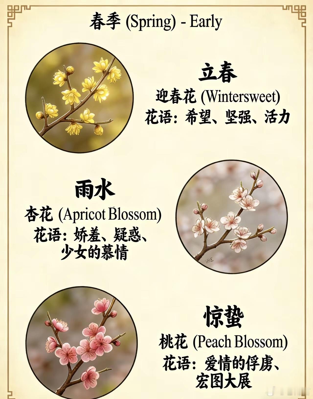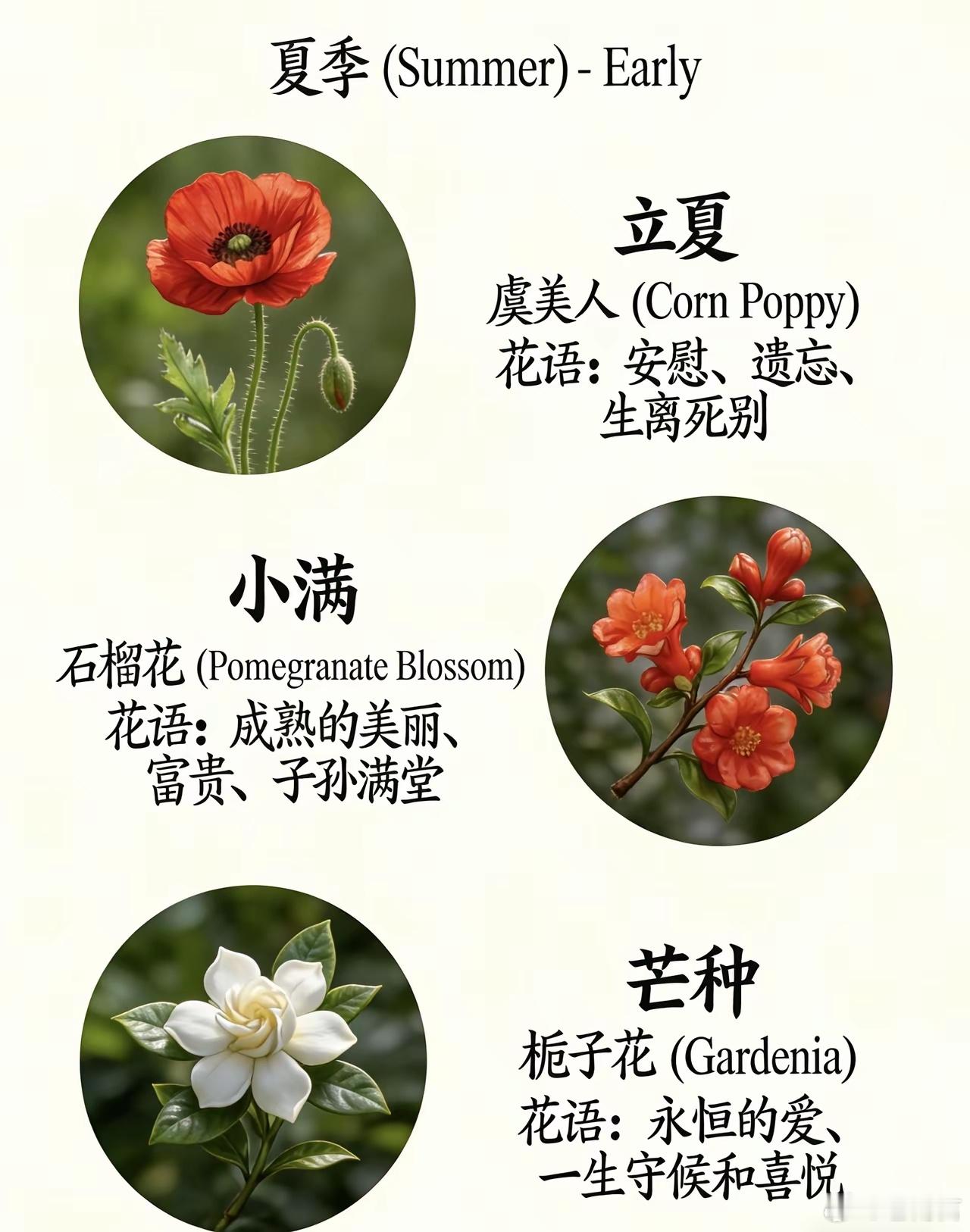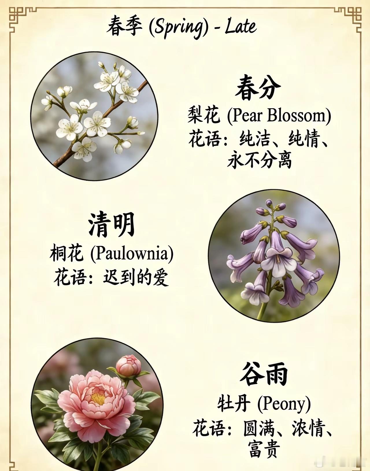 二十四节气鲜花令春季(Spring)- Early• 立春:迎春花(Wintersweet)花语:希望、坚强、活力• 雨水:杏花(Apricot Blossom)花语:娇羞、疑惑、少女的慕情• 惊蛰:桃花(Peach Blossom)花语:爱情的俘虏、宏图大展春季(Spring)- Late• 春分:梨花(Pear Blossom)花语:纯洁、纯情、永不分离• 清明:桐花(Paulownia)花语:迟到的爱• 谷雨:牡丹(Peony)花语:圆满、浓情、富贵夏季(Summer)- Early• 立夏:虞美人(Corn Poppy)花语:安慰、遗忘、生离死别• 小满:石榴花(Pomegranate Blossom)花语:成熟的美丽、富贵、子孙满堂• 芒种:栀子花(Gardenia)花语:永恒的爱、一生守候和喜悦夏季(Summer)- Late• 夏至:蜀葵(Hollyhock)花语:梦• 小暑:茉莉花(Jasmine)花语:忠贞、尊敬、清纯、贞洁• 大暑:凤仙花(Balsam Flower)花语:别碰我、怀念过去秋季(Autumn)- Early• 立秋:蓝雪花(Blue Plumbago)花语:冷淡、忧郁• 处暑:玉簪花(Hosta)花语:脱俗、冰清玉洁• 白露:秋海棠(Begonia)花语:相思、苦恋秋季(Autumn)- Late• 秋分:桂花(Osmanthus)花语:收获、吉祥、高尚• 寒露:菊花(Chrysanthemum)花语:清净、高洁、长寿• 霜降:木芙蓉(Cotton Rose)花语:纤细之美、贞操、纯洁冬季(Winter)- Early• 立冬:忍冬(Honeysuckle)花语:爱的羁绊、奉献• 小雪:山茶(Camellia)花语:理想的爱、谦让• 大雪:腊梅(Wintersweet)花语:坚毅、高洁、慈爱之心冬季(Winter)- Late• 冬至:瑞香(Daphne)花语:喜悦、光辉• 小寒:水仙(Narcissus)花语:多情、想你、自尊• 大寒:君子兰(Clivia)花语:高贵、宝贵、有君子之风