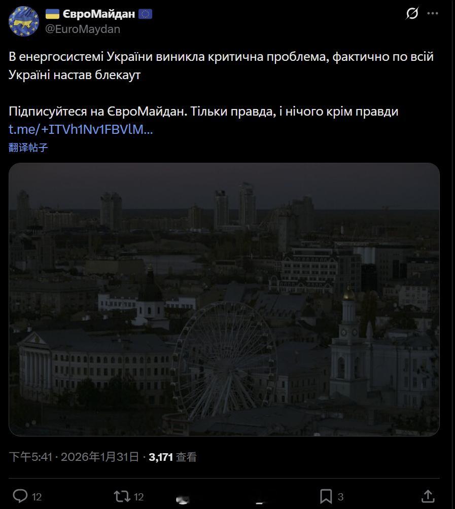 尽管俄罗斯暂停了对乌克兰能源基础设施的袭击,但今天乌克兰依然出现了大范围停电,官方说是故障。