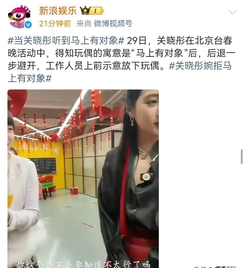 关晓彤,着实让人心生怜惜! 1 月 29 日,在北京春晚的舞台上,关晓彤一个下意识的动作,将她内心的无奈与谨慎暴露无遗,令人心疼不已。 在北京台春晚活动里,当得知手中玩偶寓意着 “马上有对象” 时,她下意识地往后退了一步,躲开了这个玩偶。工作人员赶忙上前将玩偶接走。这看似不起眼的一幕,实则暗藏着她在感情方面的小心翼翼与无奈。 28 岁的关晓彤,早已过了被催恋的阶段,然而在感情话题上却一直小心翼翼。她和鹿晗长达八年的恋情曾在内娱引起轩然大波,可到了 2025 年底,却传出了分手的消息。生日时双方互不祝福、共同持股的公司解散,她父亲点赞分手传闻后又迅速撤回,这些细节让他们的感情变得扑朔迷离。而她自始至终都没有正面回应,独自承受着外界的种种猜测。 不久前她公开表示 “感情不是必选,自由才是刚需”,这也让我们更能理解她对待感情的谨慎态度。作为一位实力派演员,她手握六部待播剧,还有三部央视正剧在身,正处于事业的关键冲刺阶段。她拒绝了超 2.3 亿元的综艺邀约,一心专注于拍戏,显然不想让感情话题分散大家对她作品的关注。 明星的感情本就处于聚光灯下,稍有风吹草动就会被无限放大。年初的恋爱谣言让她不得不发声明起诉造谣者,这样的舆论压力,换做任何人都会变得谨慎起来。 她的后退并非是抗拒爱情,而是经历过现实的磨砺。公众对她感情状态过度关注,事业上升期又需要全身心投入,还要面对过去感情留下的纷纷议论,关晓彤的谨慎不过是一种自我保护。 明星的感情生活就像在风口浪尖上行走,稍有不慎就会引发舆论的狂风暴雨。关晓彤深知这一点,所以她才会如此小心翼翼。对于她来说,感情不再是一场简单的恋爱,而是一场需要权衡利弊的选择。 在当下这个流量逐渐退去、作品才是王道的时代,关晓彤明白只有靠实力才能站稳脚跟。她不想因为感情问题而影响自己的事业发展,所以选择慢慢来。她这种在喧嚣中坚守本心的克制,实在是难能可贵。 她没有被外界的声音所左右,没有为了迎合大众而随意表态。她清楚自己的目标,也明白自己想要的是什么。在事业的道路上,她一步一个脚印,努力提升自己的演技,用作品说话。 关晓彤的故事让我们看到了一个明星在面对感情和事业时的无奈与坚持。她的谨慎不是懦弱,而是一种成熟和智慧。在这个快节奏的时代里,她懂得停下来思考,懂得为自己的未来负责。相信在未来的日子里,她能够在事业上取得更大的成就,也能找到属于自己的幸福。