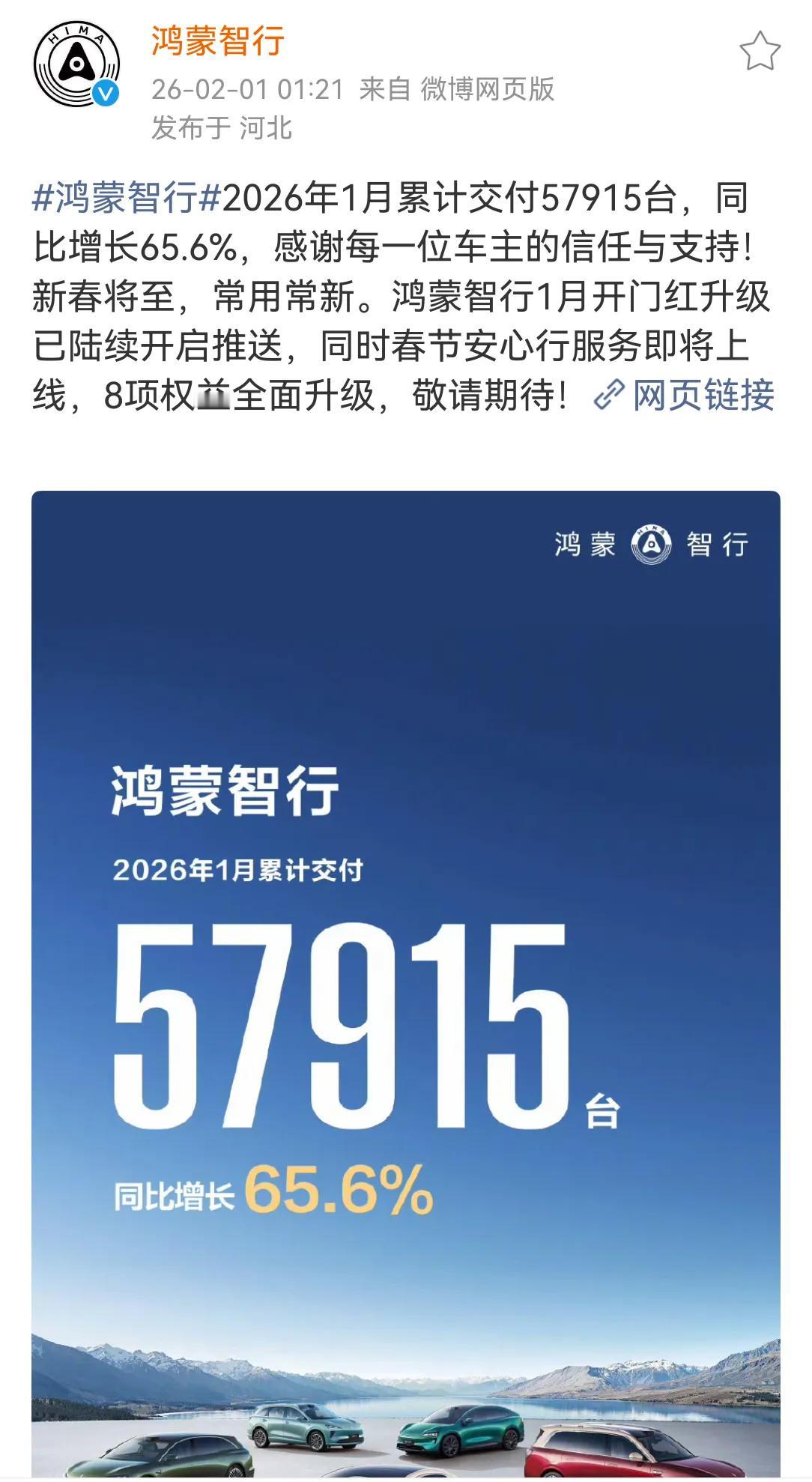 鸿蒙智行凌晨发布2026年1月销量:57915辆,同比增长65.5%[赞][赞] 刚刚鸿蒙智行官方发布一月成绩单,这算是主流车企里的第一个战报,57915辆这成绩环比是大跌的,但在1月份惨淡的车市里绝对是耀眼的。 但打工人苦啊,鸿蒙智行官号半夜还得工作[捂脸][黑线]