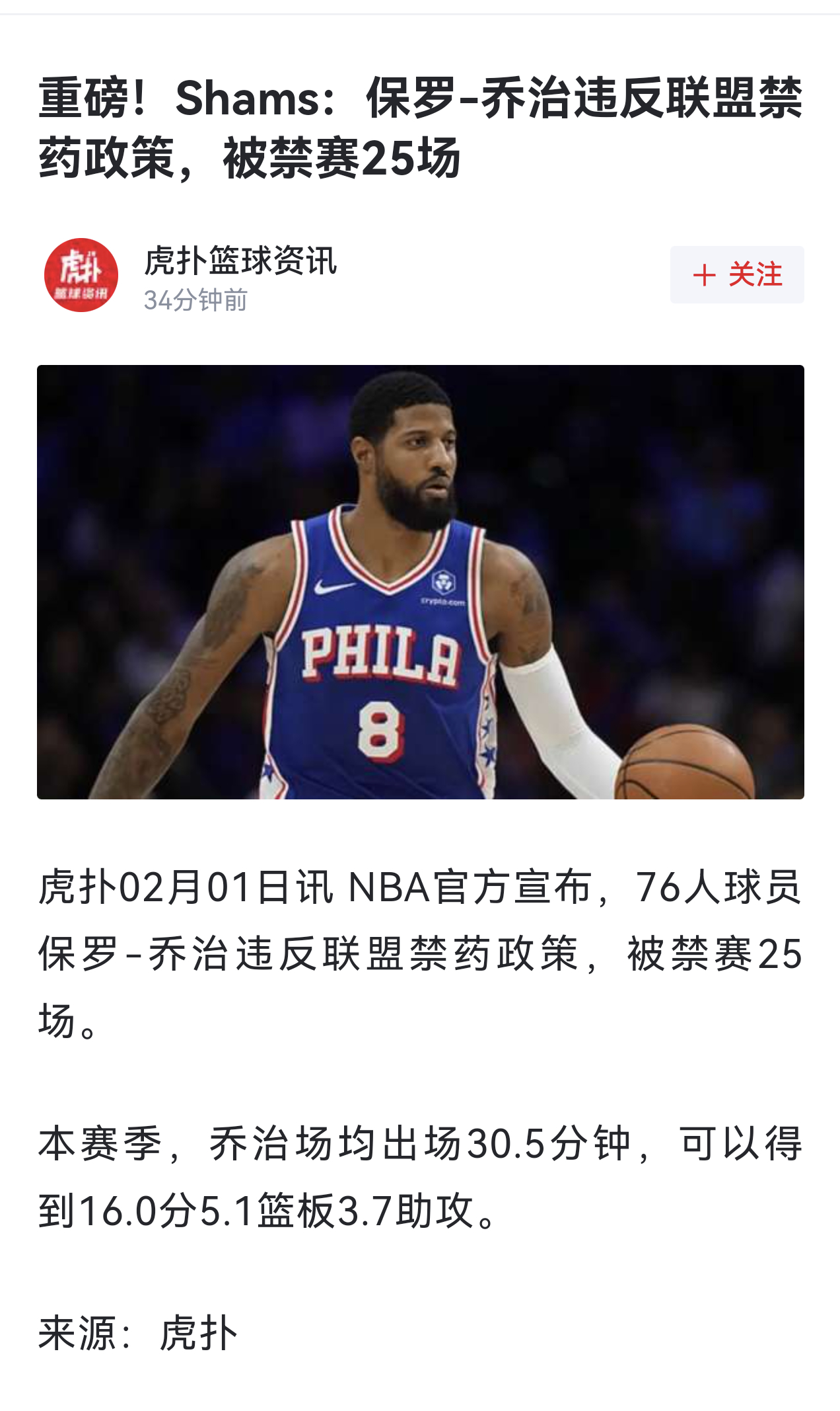 保罗乔治因违反联盟禁药政策,被禁赛25场~~
