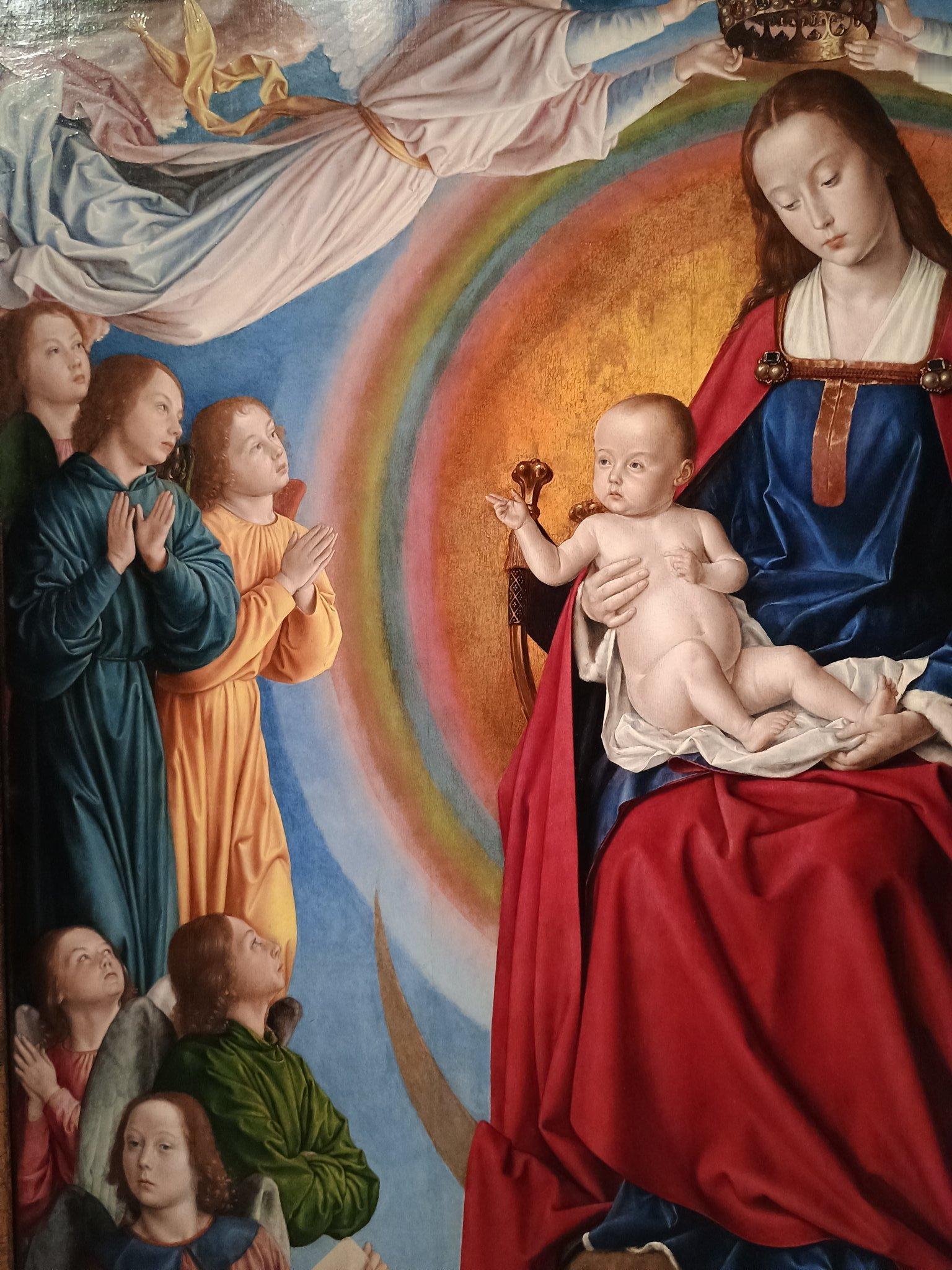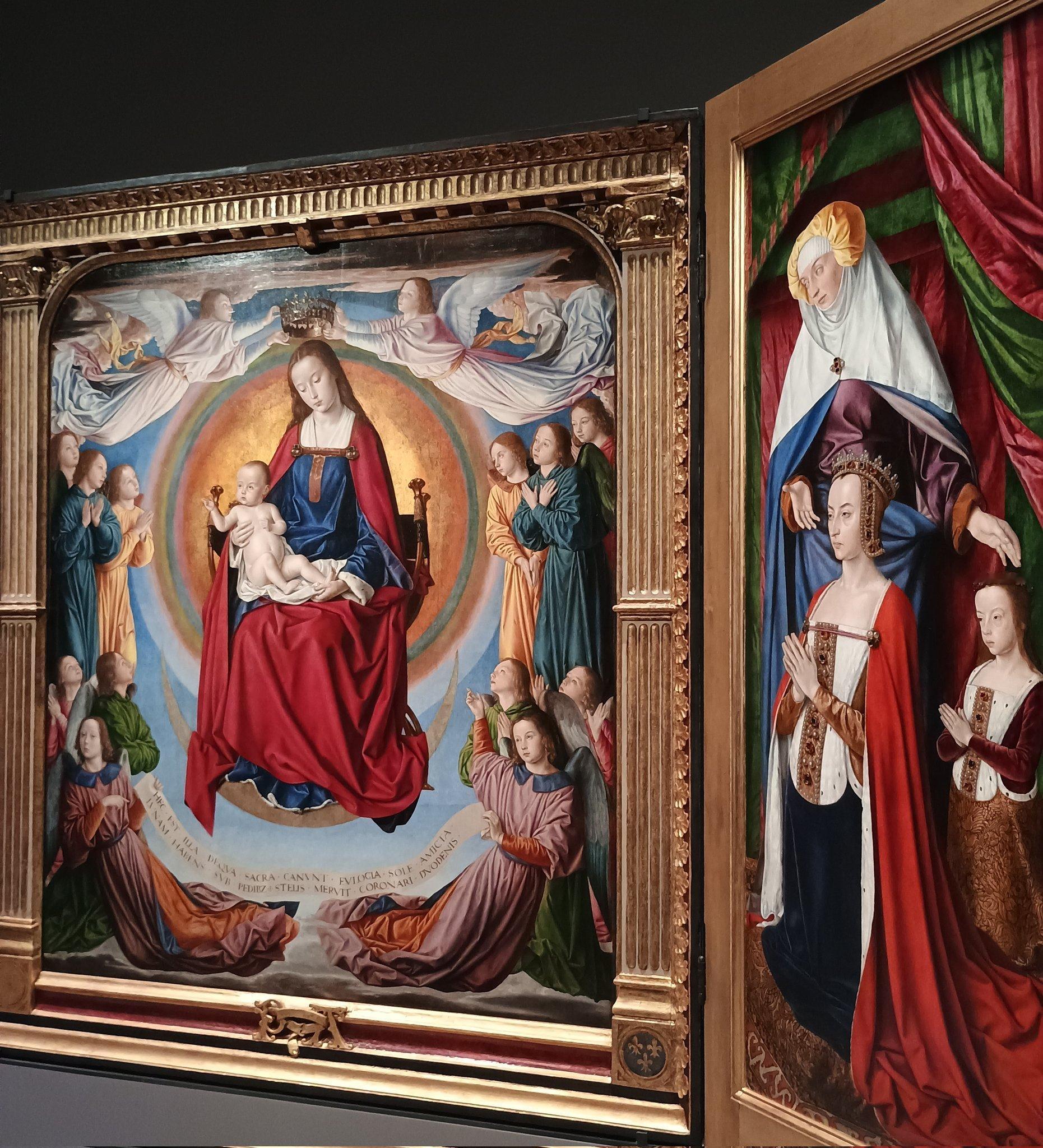 Triptyque du Maître de Moulins(1498)藏于法国中部穆兰(Moulins)主教座堂,“Moulins的画师”被认为是Jean Hey (Jean Hay) (c. 1475开始作为画家活动 c. 1505去世) La Vierge à l'Enfant du Triptyque de Moulins reste une vision céleste mais, contrairement à sa prédécessrice du diptyque de Jeanne de France, elle est représentée à la même hauteur que les donateurs figurant sur les volets latéraux.